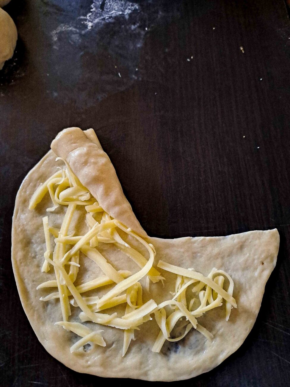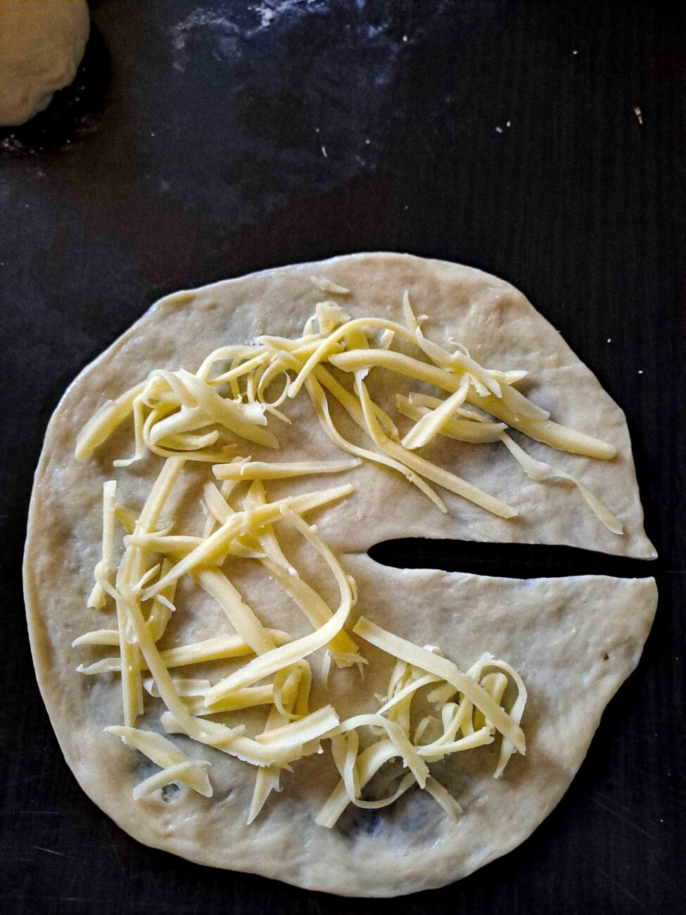Разточете всяка топка в кръг с дебелина около 3-4 мм. Направете разрез от центъра към ръба на всеки кръг. По желание намажете разточените кръгове с масло и поръсете с настъргания кашкавал или избраното твърдо сирене. Навийте тестото на фуния, като започнете от разреза, и притиснете широката част върху плота, за да оформите питките.