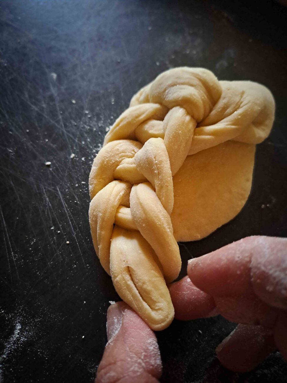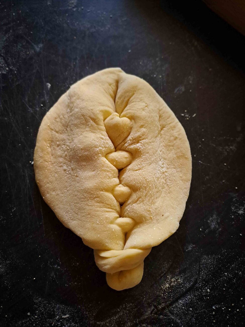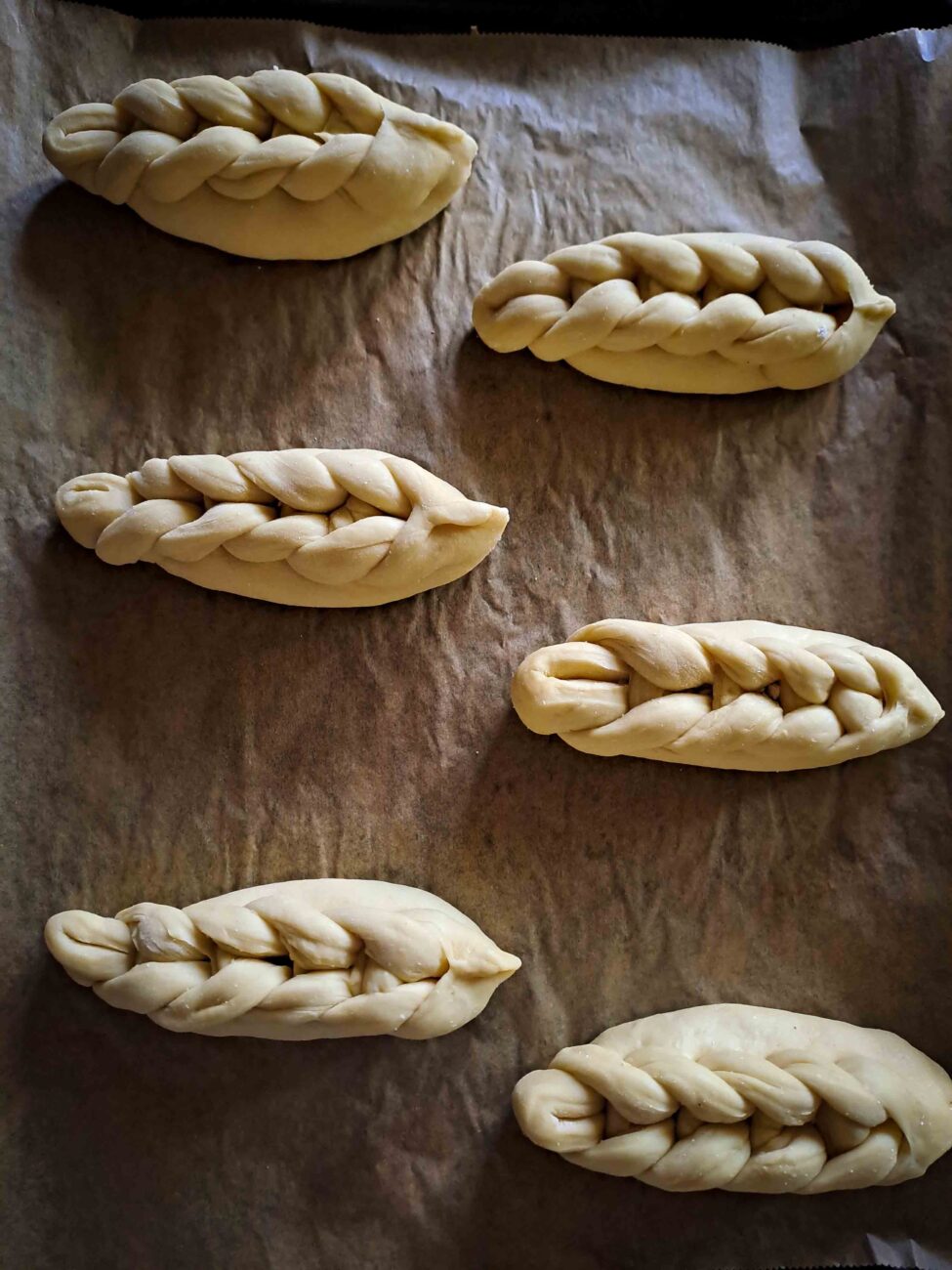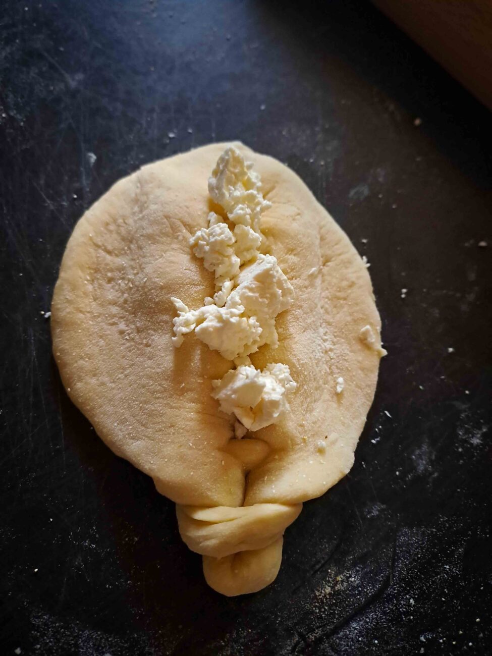 Разточете всяка топка на кръг с диаметър около 15 см върху добре набрашнена повърхност. Сгънете кръга на две и направете 6 разреза с дължина около 2-2.5 см на сгъвката. Хванете тестото на първия разрез, отворете го и прокарайте втория разрез през него, и така нататък, докато оплетете всички разрези. Обърнете тестото с плетката отдолу, отворете двете половини, добавете сиренето в центъра и съберете двата края, като ги запечатате добре, за да предотвратите изтичане на сиренето по време на печене.