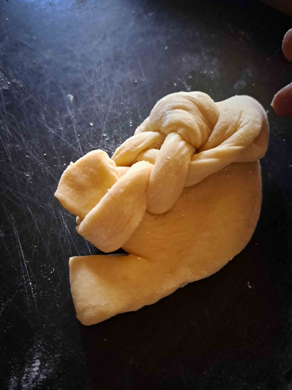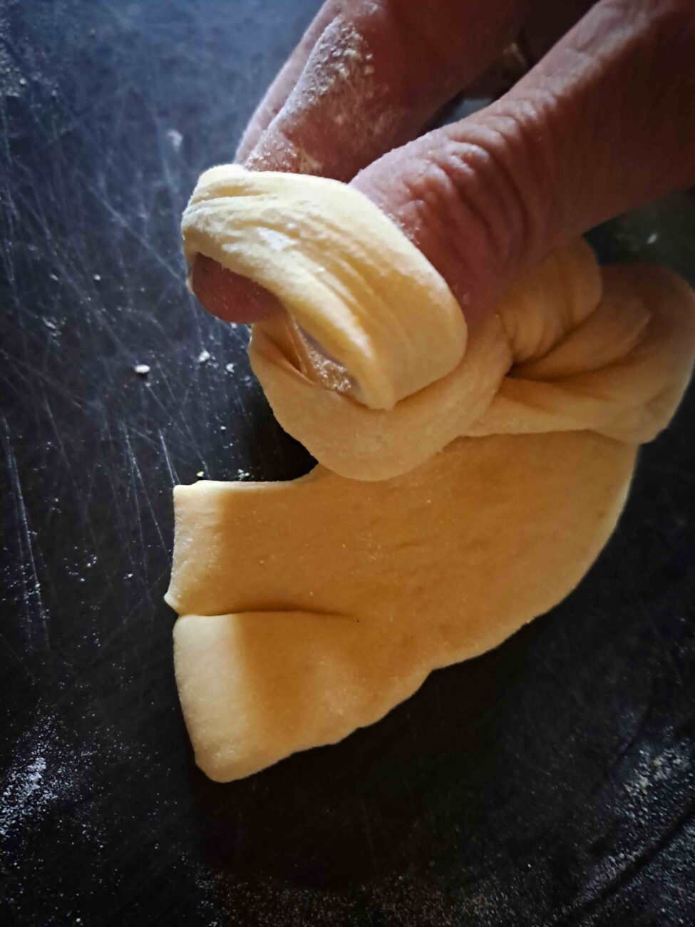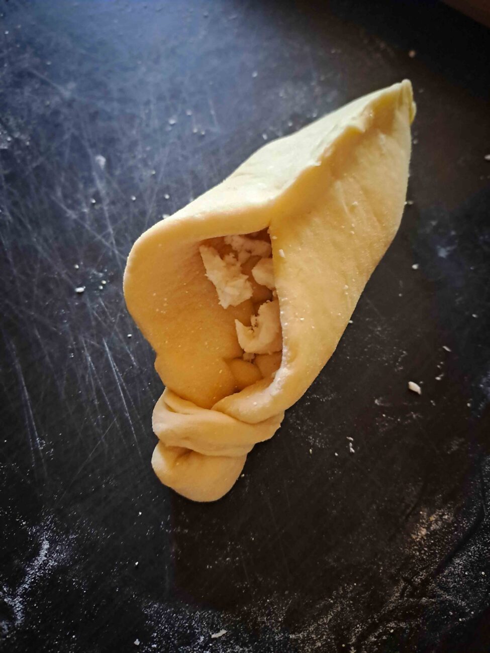 Разточете всяка топка на кръг с диаметър около 15 см върху добре набрашнена повърхност. Сгънете кръга на две и направете 6 разреза с дължина около 2-2.5 см на сгъвката. Хванете тестото на първия разрез, отворете го и прокарайте втория разрез през него, и така нататък, докато оплетете всички разрези. Обърнете тестото с плетката отдолу, отворете двете половини, добавете сиренето в центъра и съберете двата края, като ги запечатате добре, за да предотвратите изтичане на сиренето по време на печене.