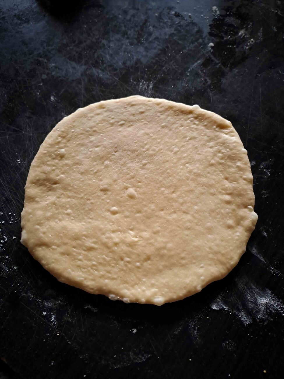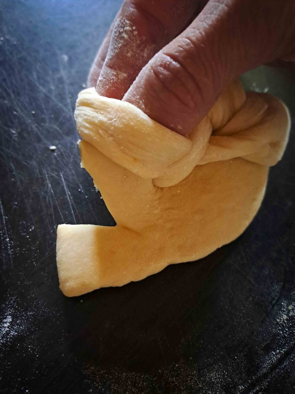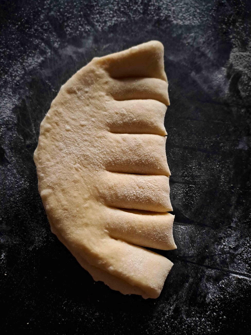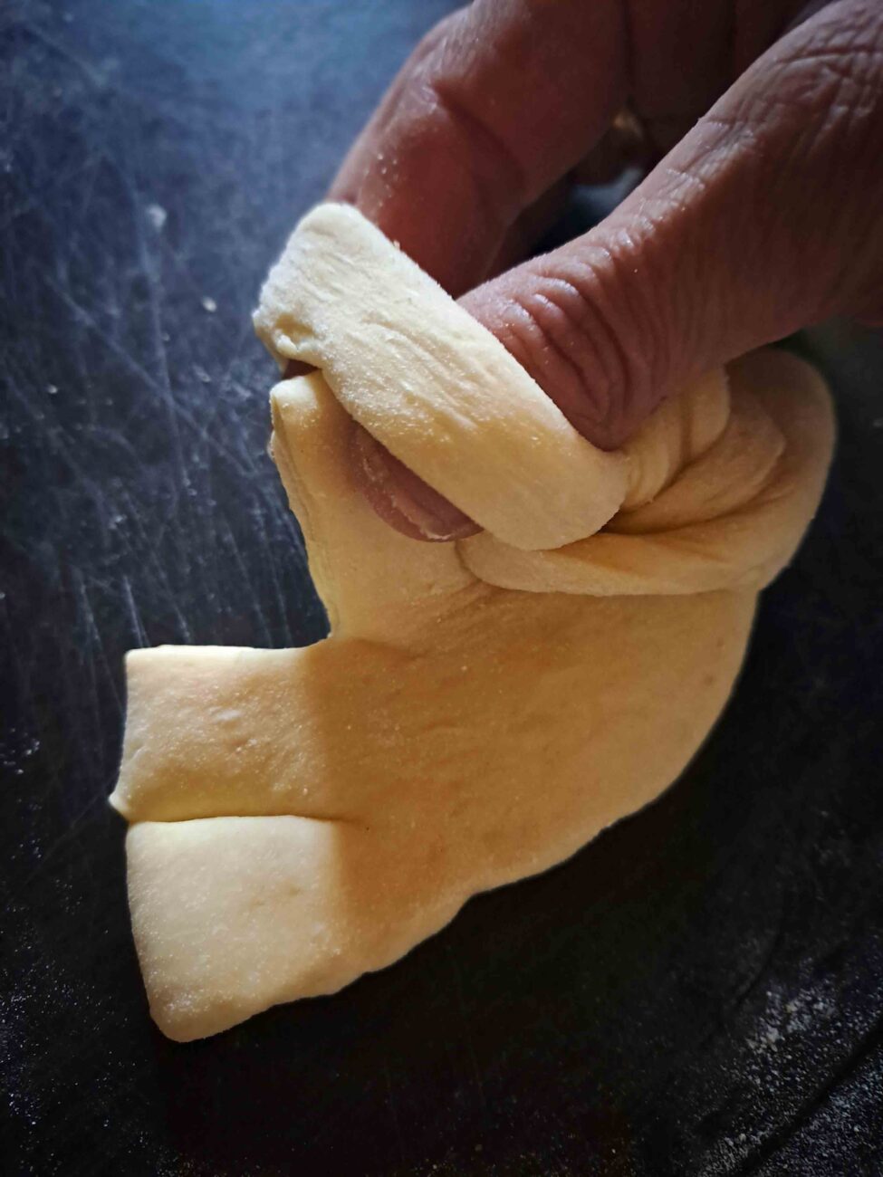 Разточете всяка топка на кръг с диаметър около 15 см върху добре набрашнена повърхност. Сгънете кръга на две и направете 6 разреза с дължина около 2-2.5 см на сгъвката. Хванете тестото на първия разрез, отворете го и прокарайте втория разрез през него, и така нататък, докато оплетете всички разрези. Обърнете тестото с плетката отдолу, отворете двете половини, добавете сиренето в центъра и съберете двата края, като ги запечатате добре, за да предотвратите изтичане на сиренето по време на печене.