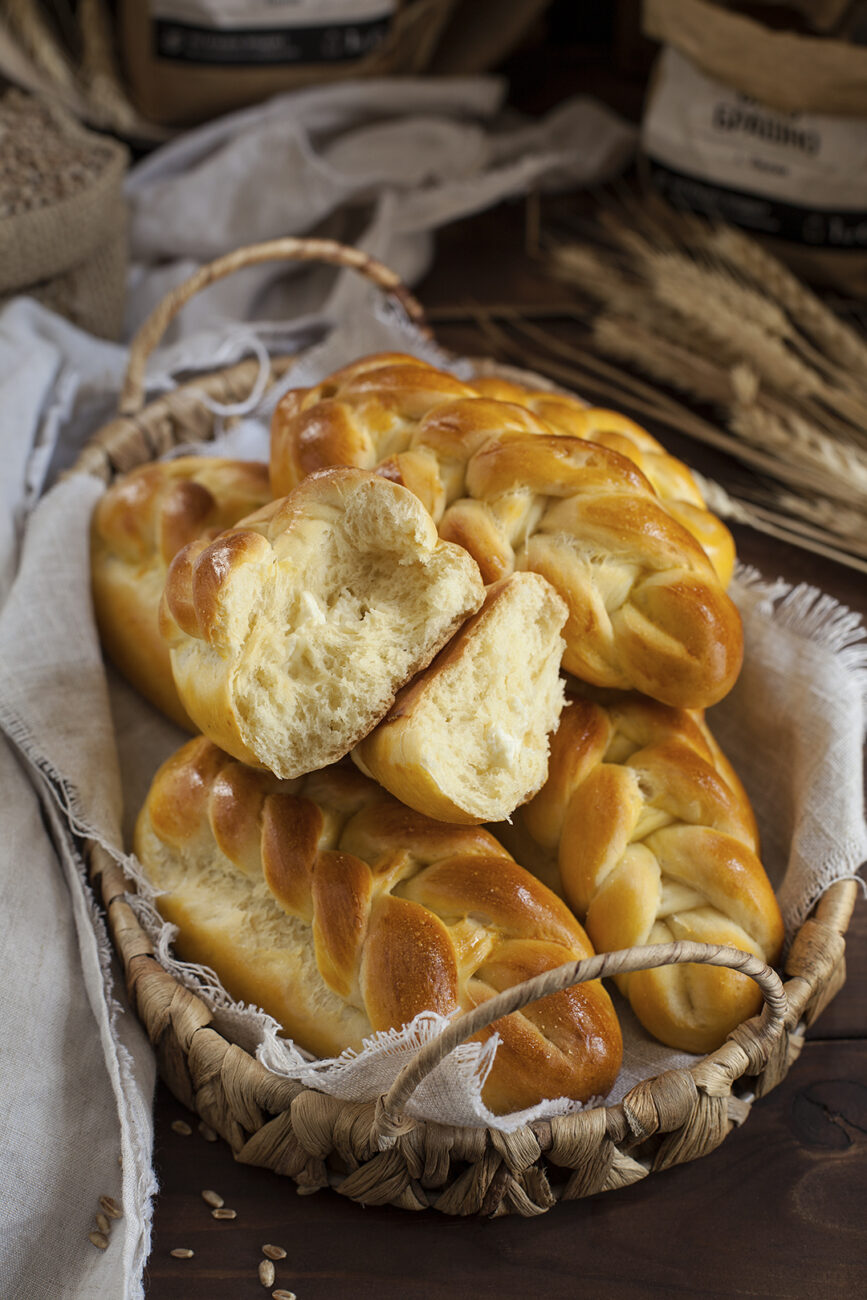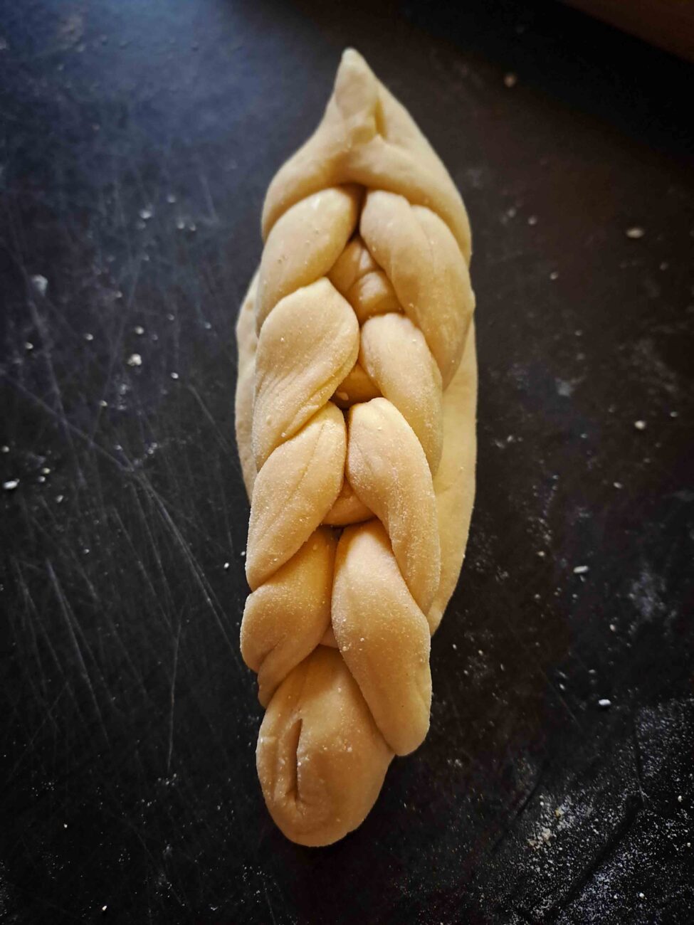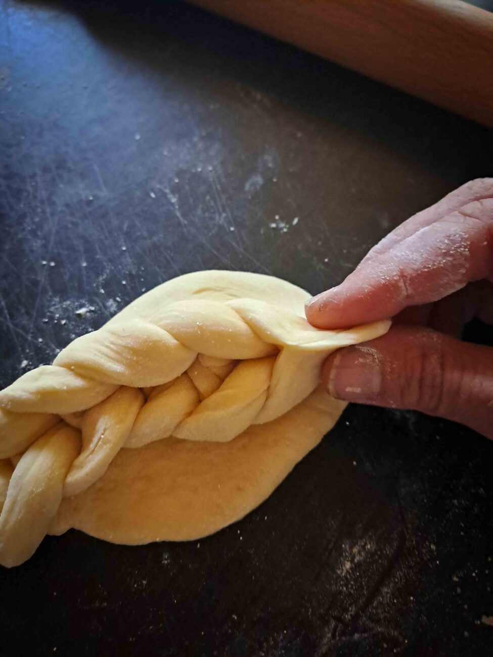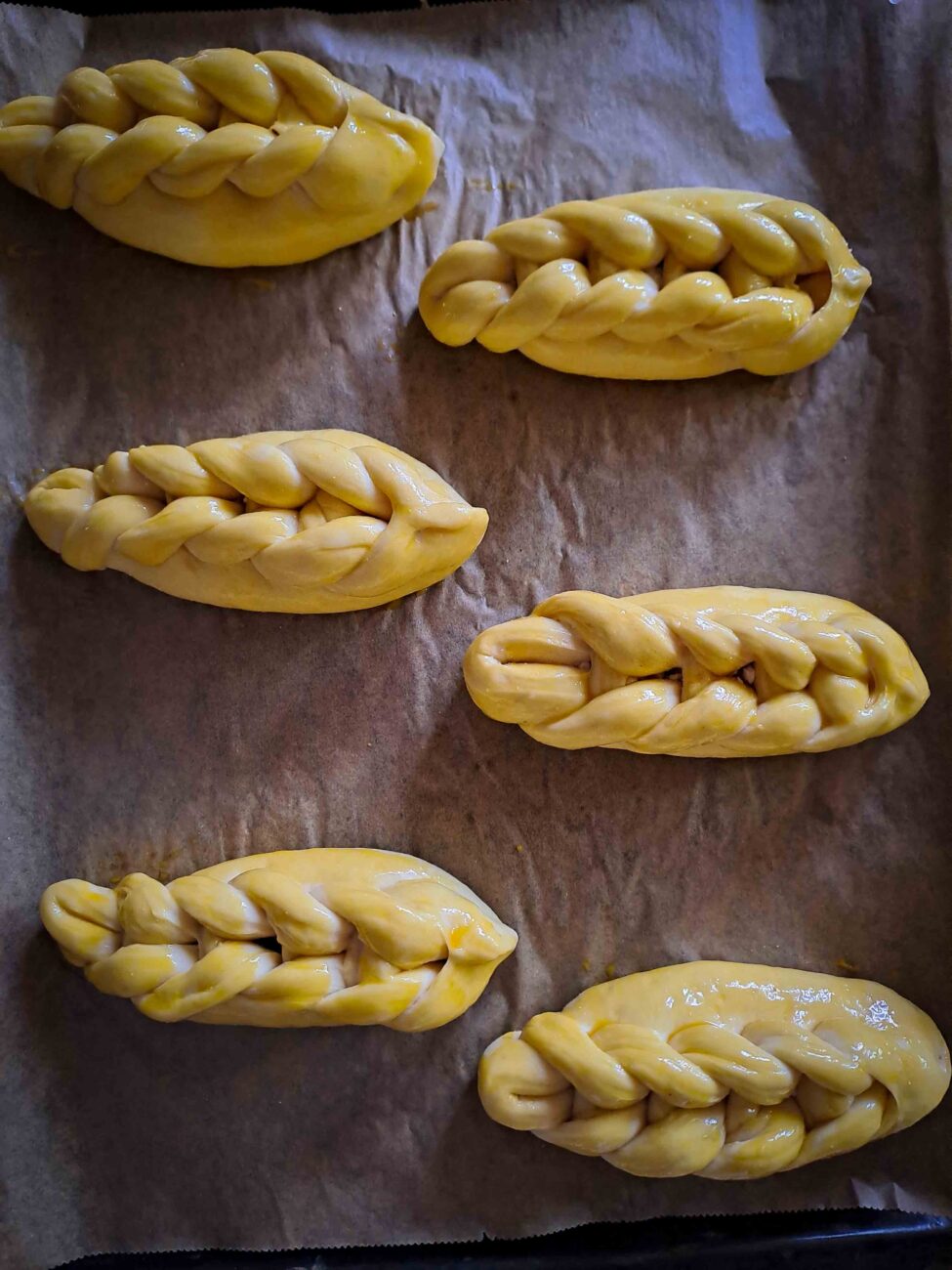 Поставете готовите плетени питки в тава, покрита с хартия за печене, и ги оставете да втасат отново за около 30-40 минути. Загрейте фурната на 190°C, намажете питките с разбит жълтък, смесен с малко прясно мляко, и ги изпечете за около 20 минути или до постигане на желания загар.