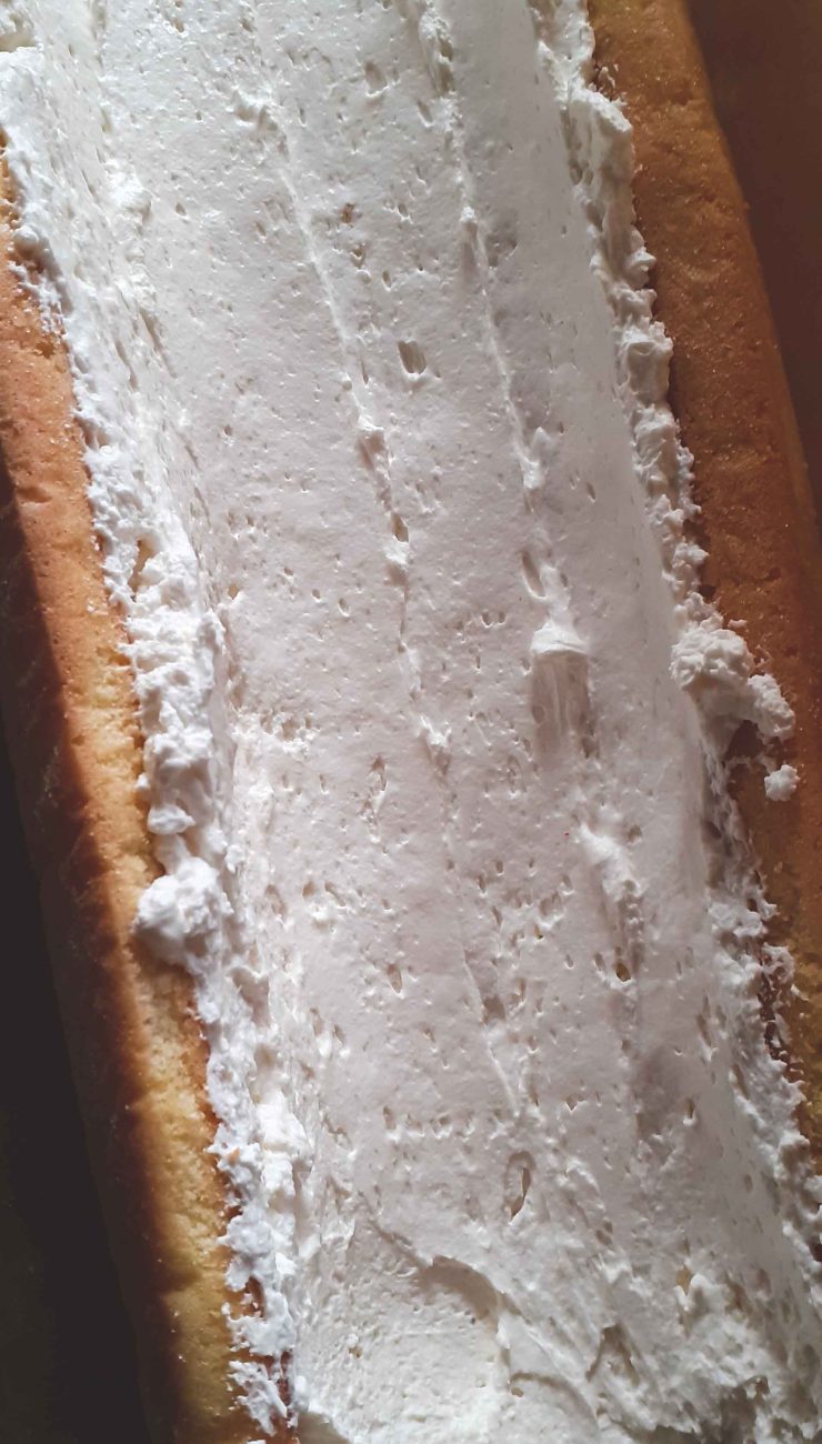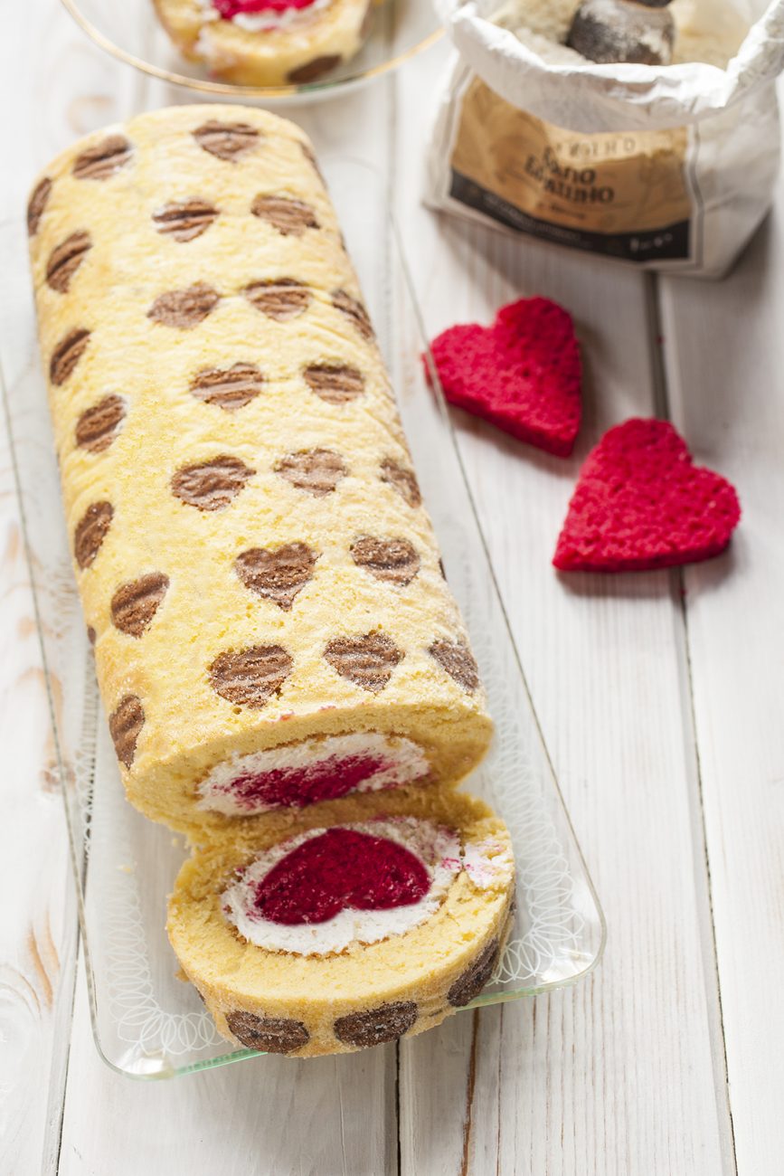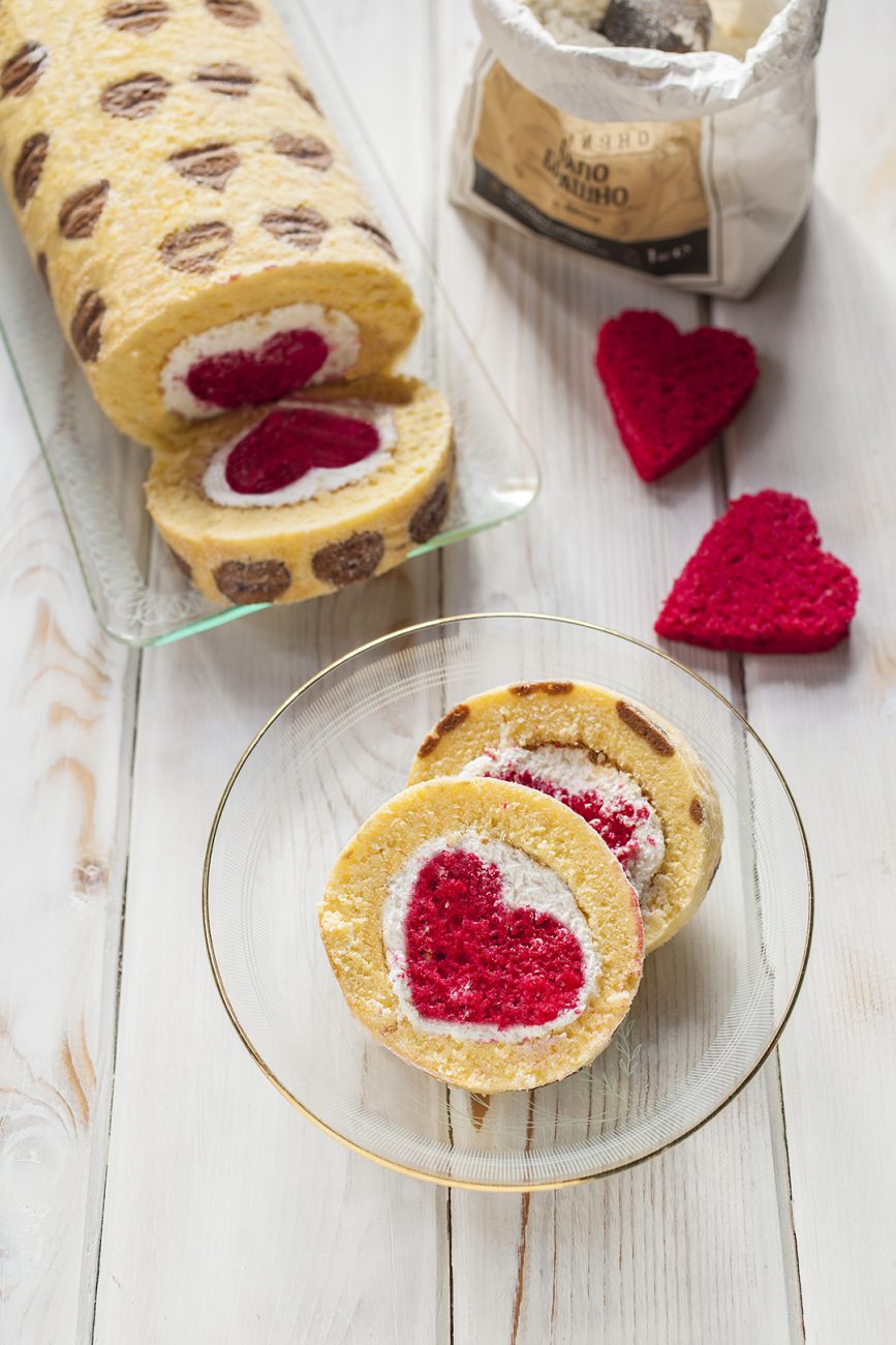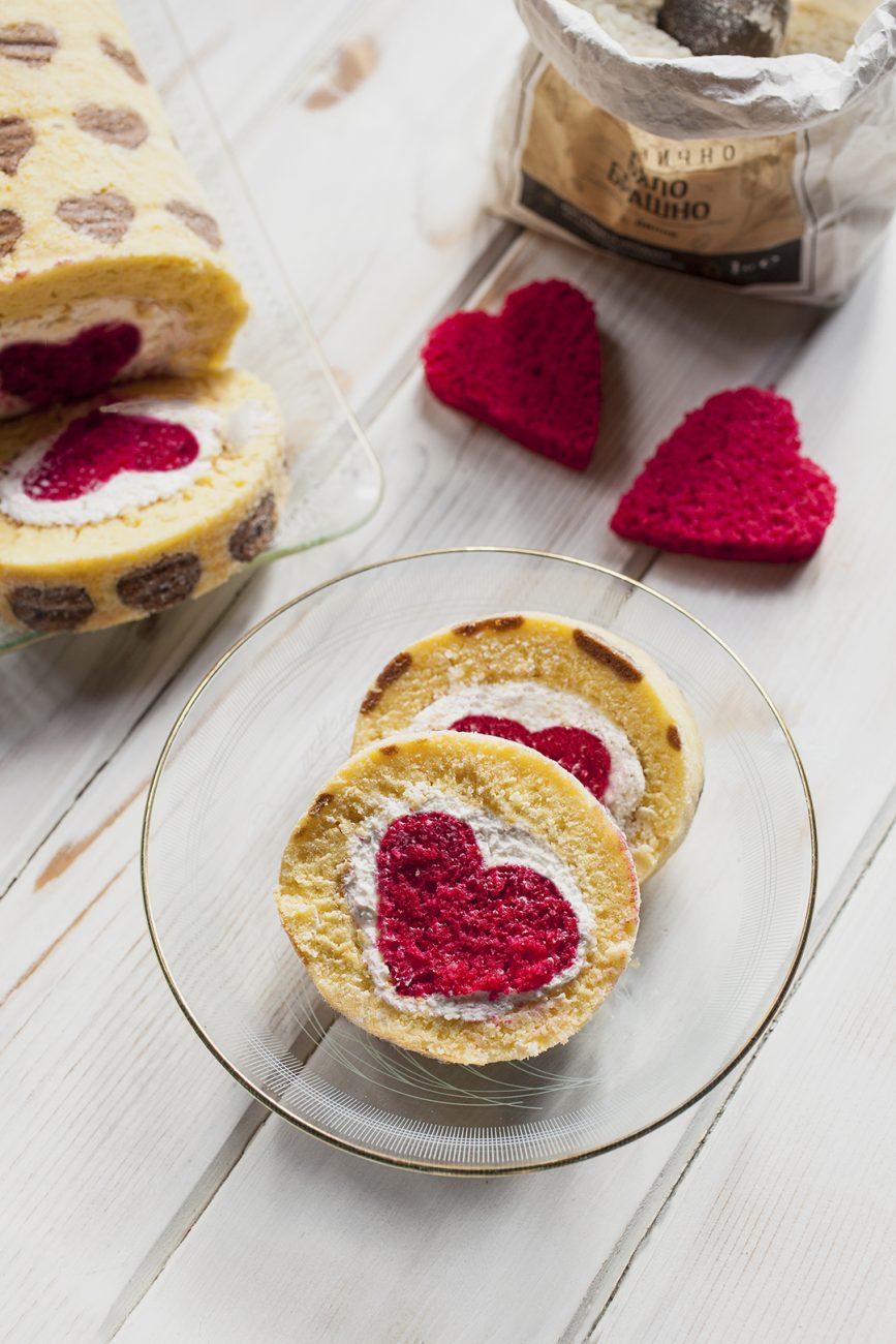 Сега остава да сглобите рулото – вземете навития блат, отвийте и леко го изпънете, намажете го с крема, центъра сложете слепените сърца, съединете двата края и обърнете с “шева” отдолу. Оставете го за 3-4 часа или една нощ да стегне в хладилника.