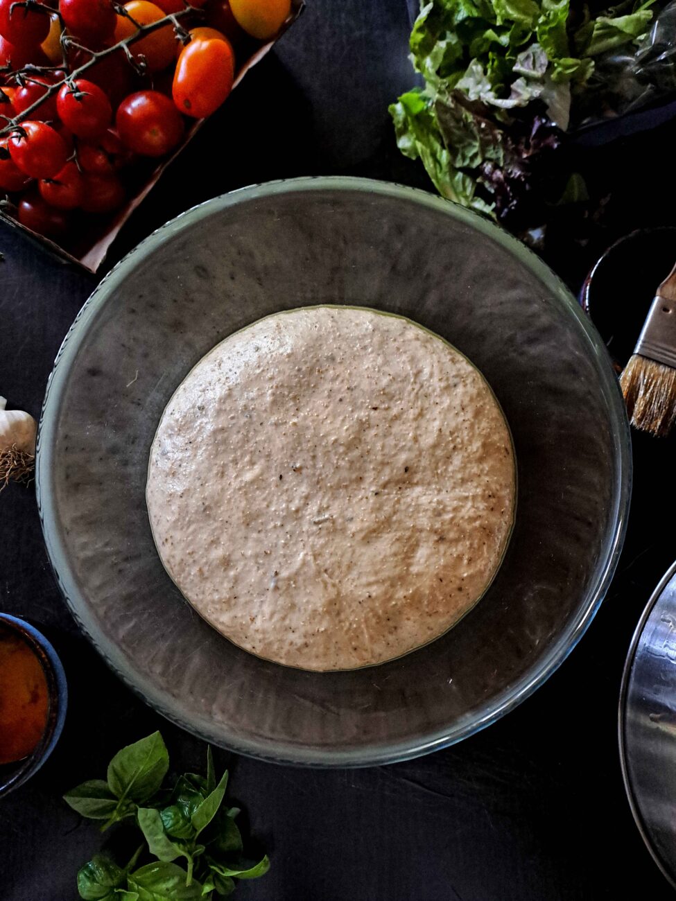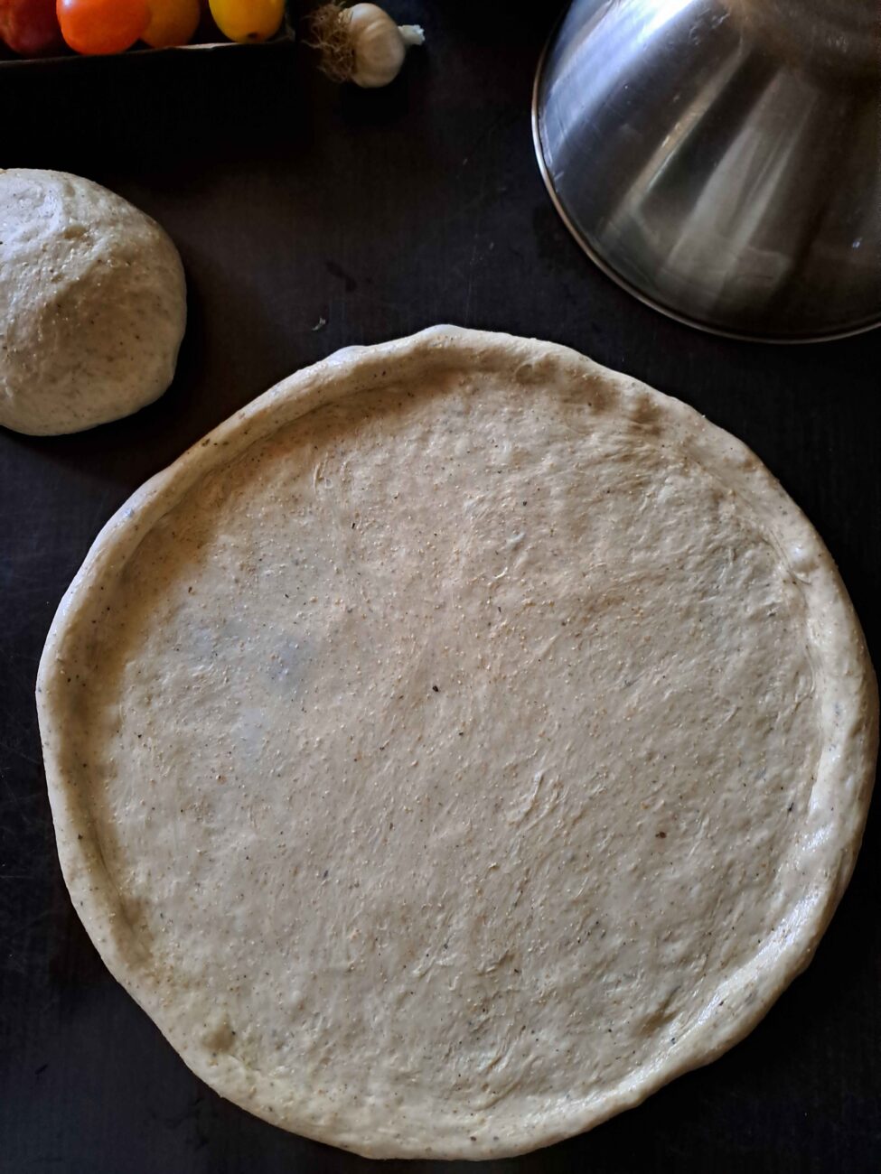 Включете фурната за загряване на 220°C. Може да направите само една купа, а тестото за втората да приберете веднага в хладилника, където да втасва бавно и да я изпечете на следващия ден. Оформянето започва, като обърнете металната купа върху плота и намажете дъното с малко зехтин. Вземете едната топка тесто, разточете я в кръг, като се постараете да направите борд, и преместете кората върху купата.
