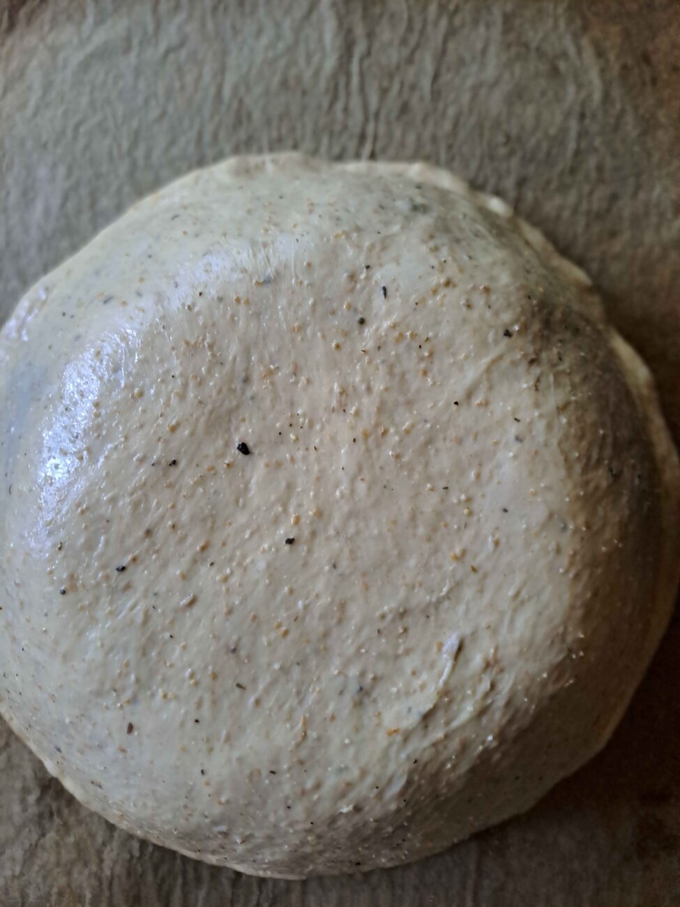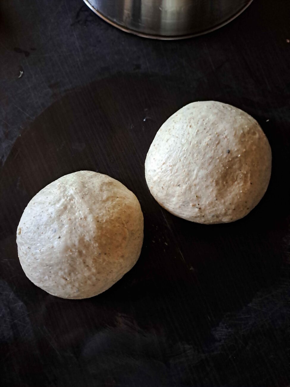 От посочените продукти измесете много добре меко тесто, прехвърлете го в намазнена купа, покрийте я и оставете тестото да втаса. Втасалото тесто изсипете внимателно върху леко набрашнен плот, разделете го на две еднакви части, оформете топки и ги оставете да починат 10 минути.