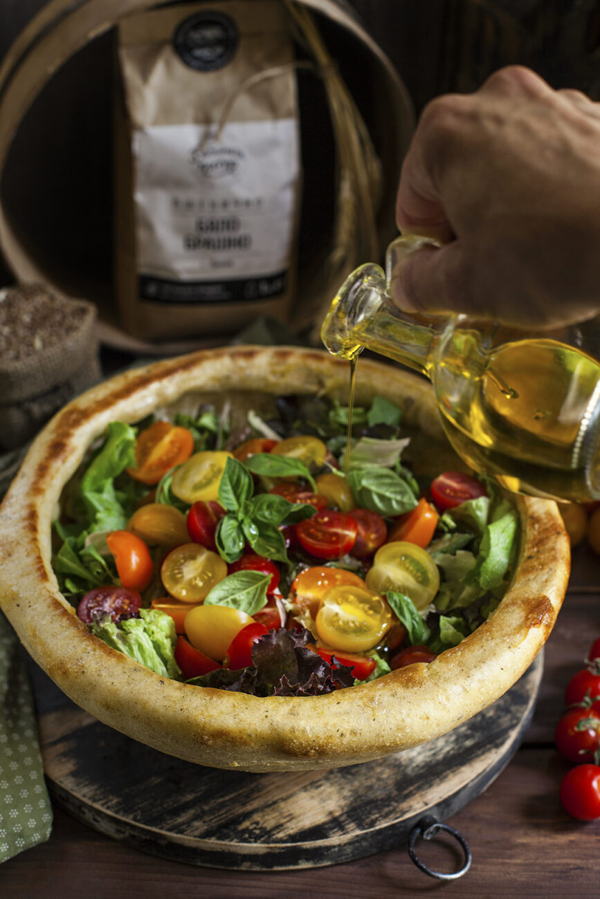 Салата в тестена купа- не е ли гениална тази идея! В разгара на сезона на свежите зеленчуци, предлагаме иновативен начин да сервираме салатата – направо с хляба. Вдъхнови ни публикация във виртуалното пространство, но я адаптирахме за работа с нашето невероятно брашно от лимец, за повече вкус аромат и изобилие от фибри.