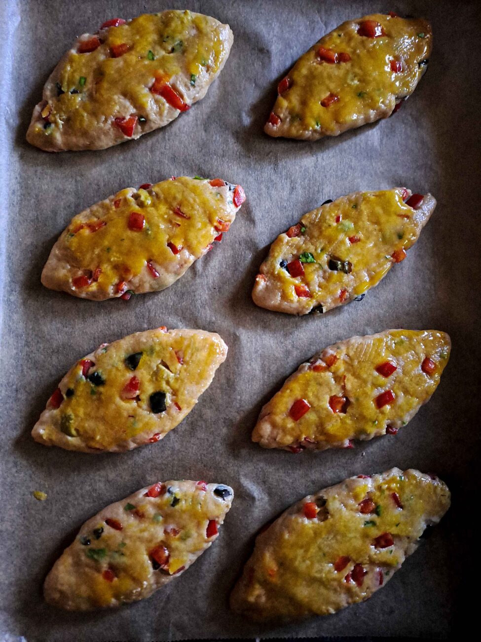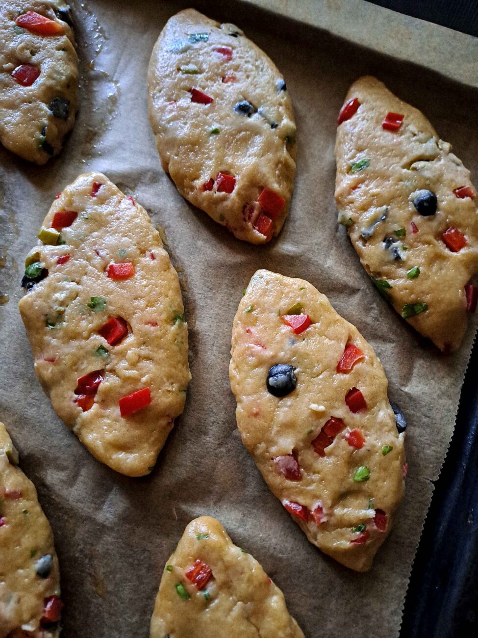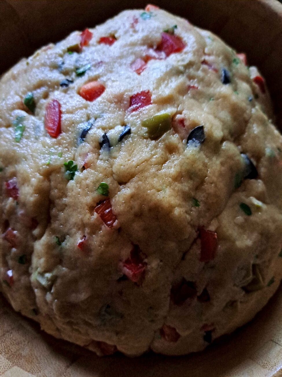 Омесете добре всички продукти без чушките, маслините и свежите подправки. Когато получите еднородно меко тесто, добавете ситно нарязаните чушки, маслини и подправките и смесете добре.
