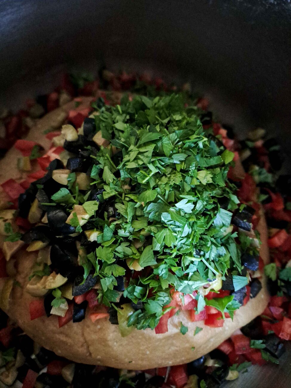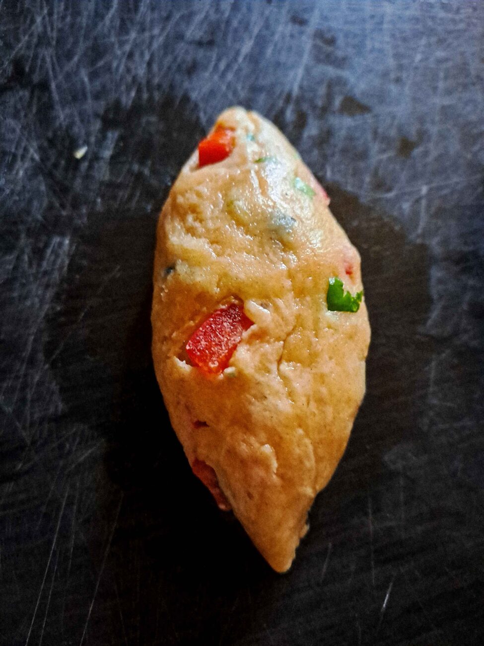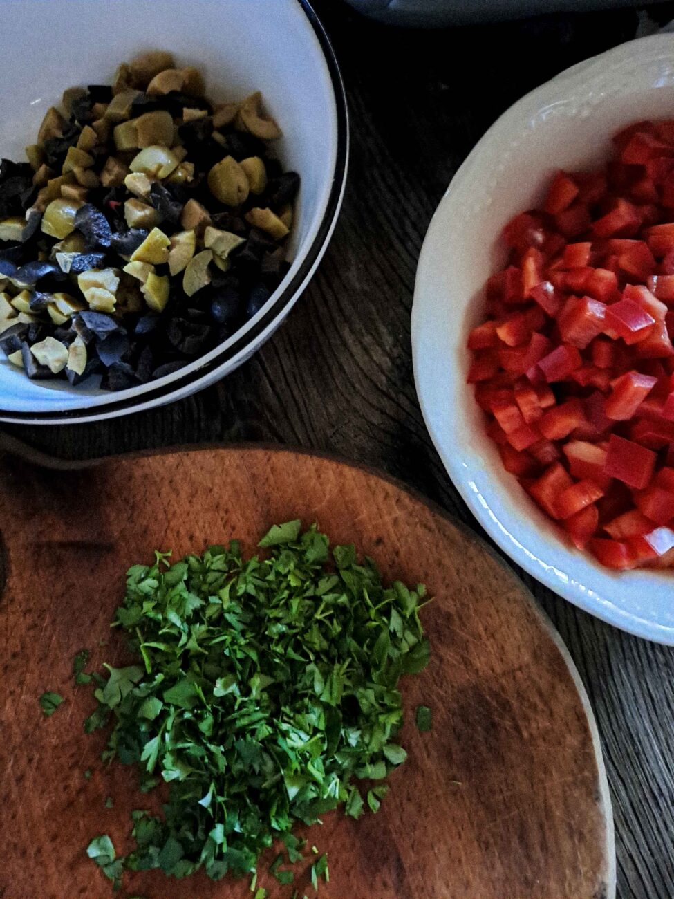 Омесете добре всички продукти без чушките, маслините и свежите подправки. Когато получите еднородно меко тесто, добавете ситно нарязаните чушки, маслини и подправките и смесете добре.