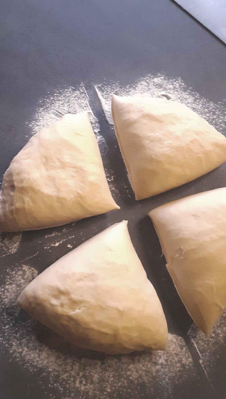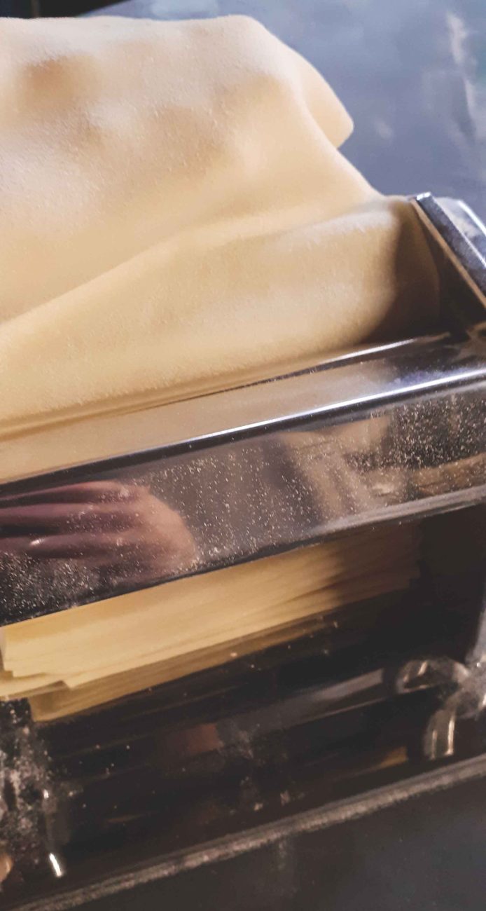 Първо омесете на ръка тестото, като последните 55 гр. от водата добавете на части. Трябва да получите твърдо тесто, макар и не добре омесено. След като мине през машината за паста няколко пъти ще се изглади. Когато сте готови с тестото, разделете го на 4 къса, оформете топки, покрийте ги и оставете да починат за 1 ч.