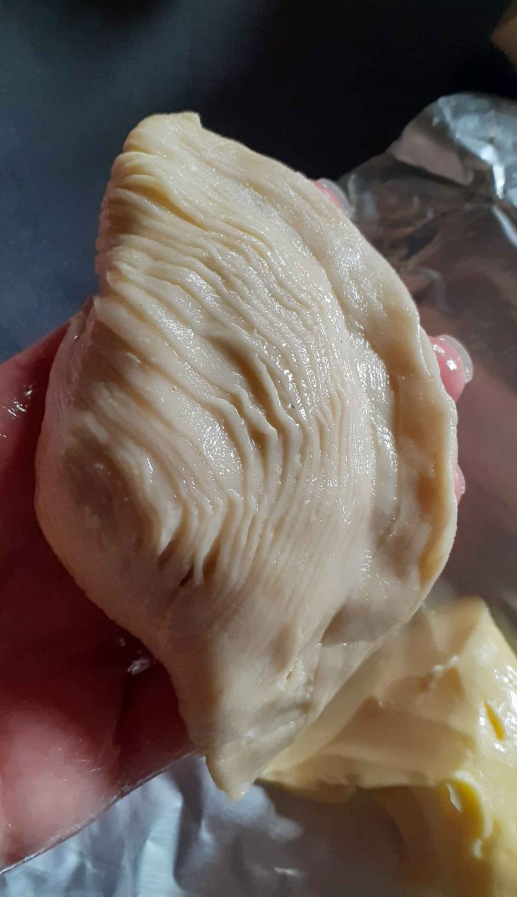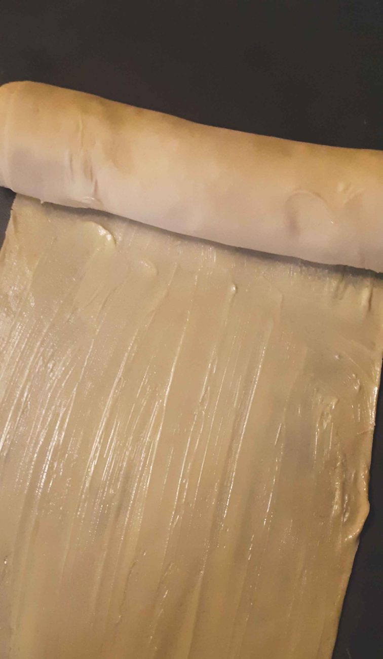 Разтеглете я настрани колкото е възможно, намажете я с мекото масло на не много тънък слой и навийте на руло.Повторете същите действия и останалото тесто – разточвате, мажете, навивате върху първата и т.н.