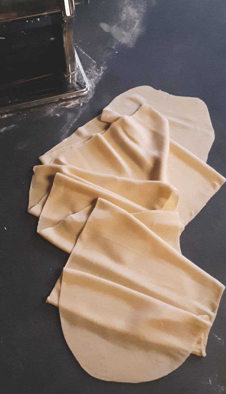 Вземете една топка, разточете я с точилка до ширината на машинката и прекарайте тестото през най-широката степен.Сгънете горната част към центъра, след това и долната и отново прекрайте през степен № 1. Направете това още 2 пъти, след което през всички останали степени до най-тънката.