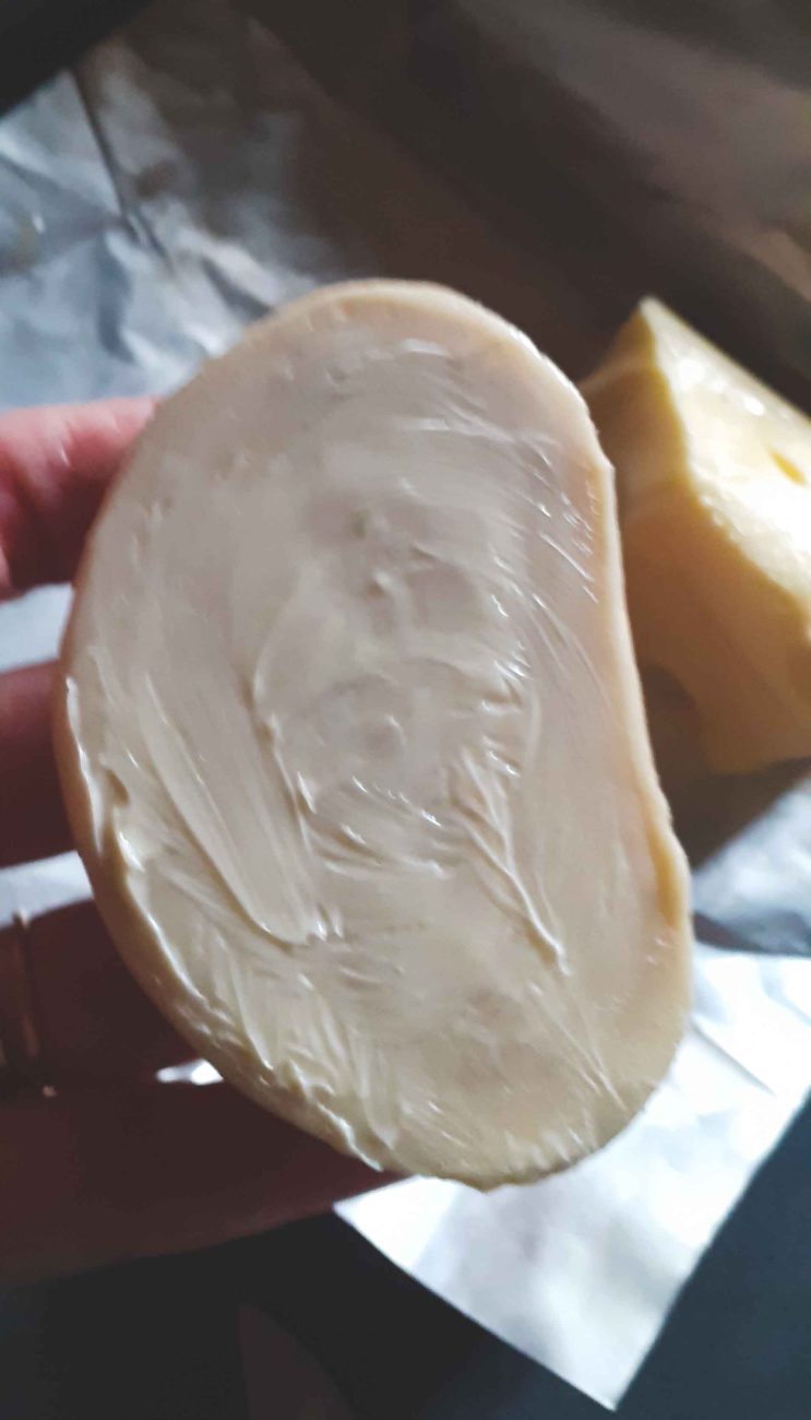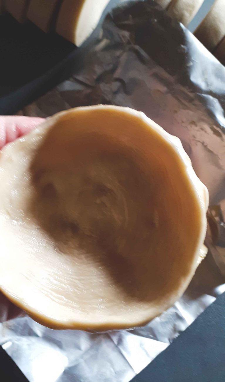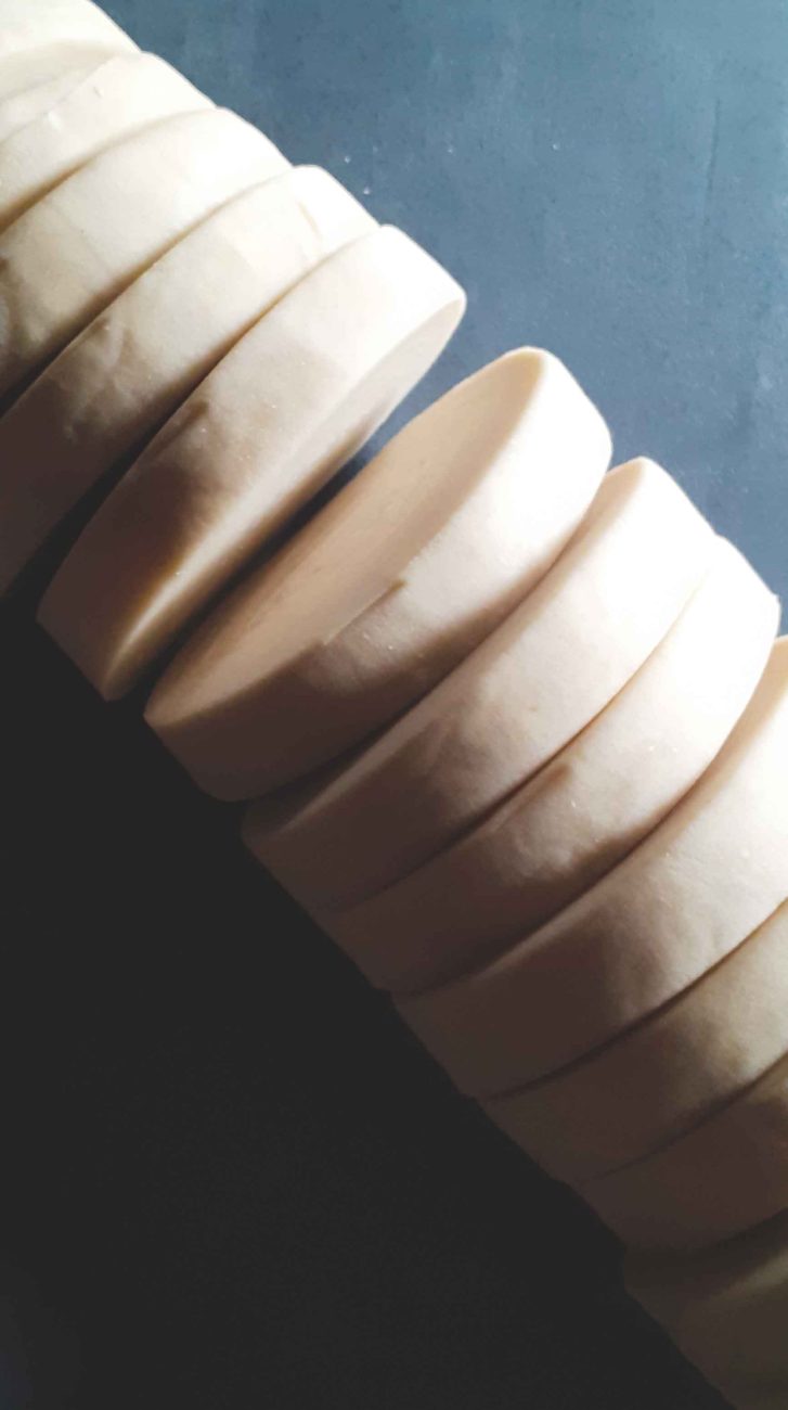 Включете фурната на 200С, извадете тестото от хладилника и нарежете рулото на резени с дебелина 1-1.5 см. Всеки резен намажете с меко масло и започнете да избутвате с палци тестото нагоре, докато обиколите цялата повърхност.