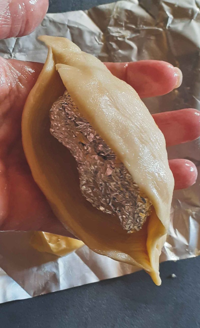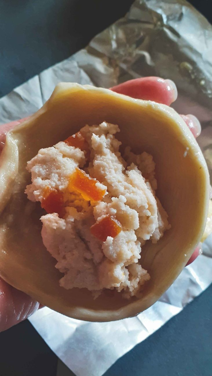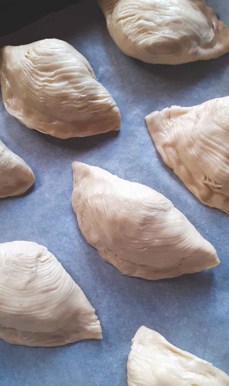 Ще усетите пластовете тесто много ясно, сложете в центъра от пълнежа и прещипете двата края, за да запечатате отвора.