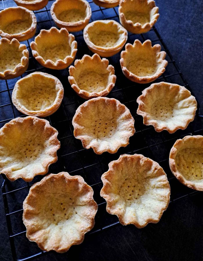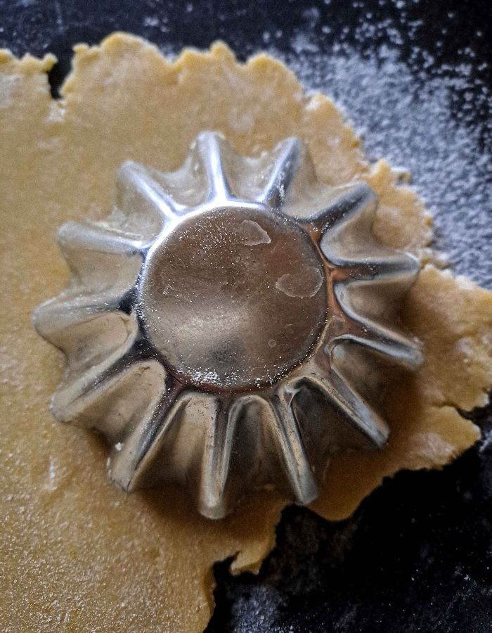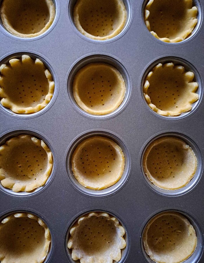 Когато сте готови да преминете към изпичането на черупките, загрейте фурната на 160 градуса. Извадете тестото, поставете лист пекарска хартия на плота и разточете тестото до дебелина от 3 до 3,2 мм. С ринг с диаметър 8 см или с форма за сладки нарежете тестото, поставете във формата и притиснете внимателно с помощта на лъжица, за да заеме хубаво формата.