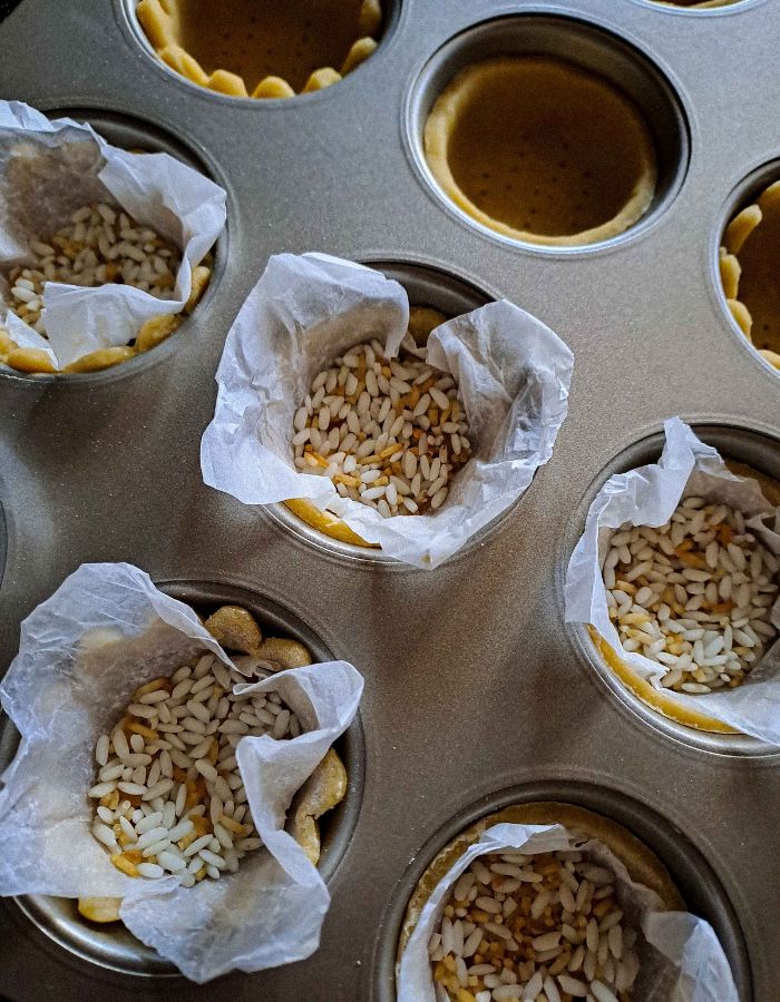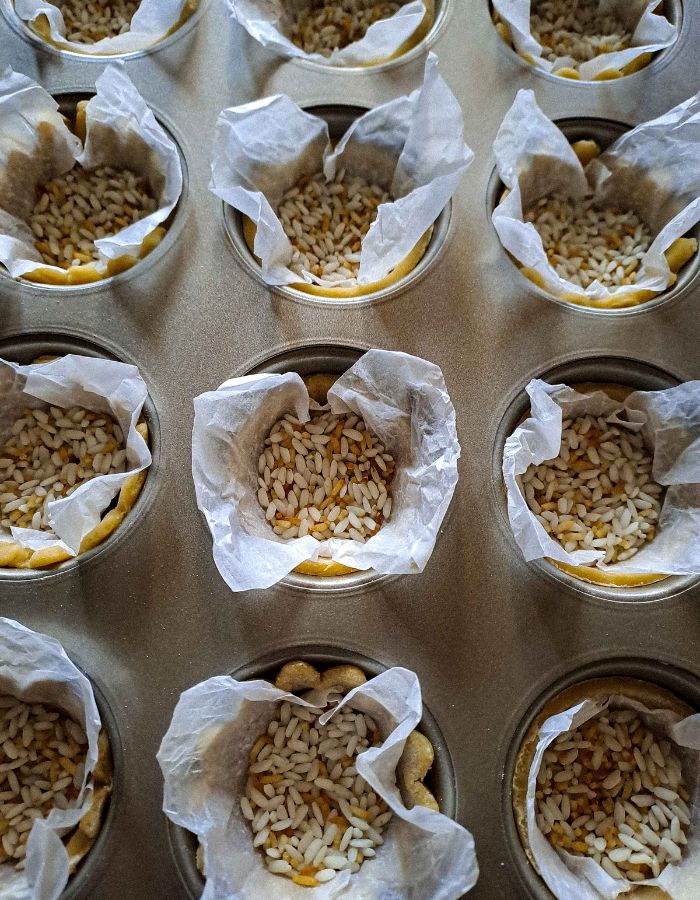 Надупчете тестото с вилица по дъното. Във всяко гнездо сложете къс хартия за печене, върху него сложете по 1 ч.л ориз (за да не се надигне по време на печене) и изпечете така за 7-8 минути, след което отстранете хартията и ориза, и допечете до порозовяване на ръбовете. След изпичане оставете черупките за 2-3 минути във формите, след което ги извадете и охладете върху решетка.