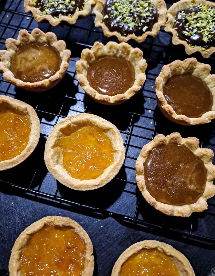 Тарталети със сладко от круши и крем от шам фъстък, солен карамел и шоколад