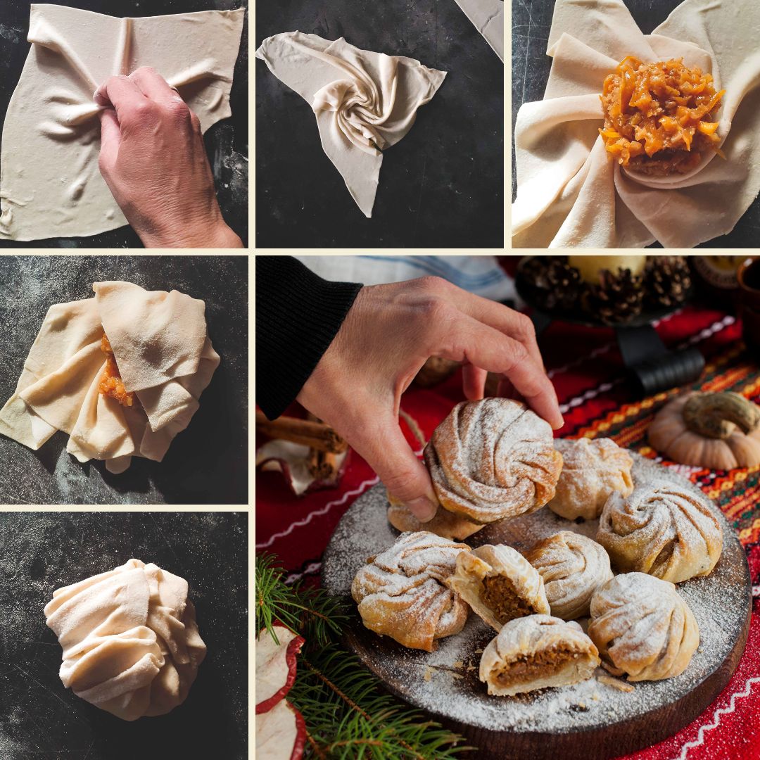 Когато приключите с точенето, нарежете кората на четири части, хванете с пръсти средата на едната четвъртина и леко повдигнете центъра, след което я завъртете надясно, сложете в центъра от плънката и съберете крайчетата върху нея, обърнете я и я сложете в тавата. Повторете това с