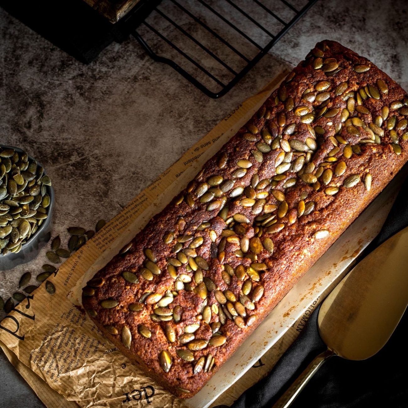 Изсипете сместа във формата за печене. Отгоре поръсете с тиквените семки.