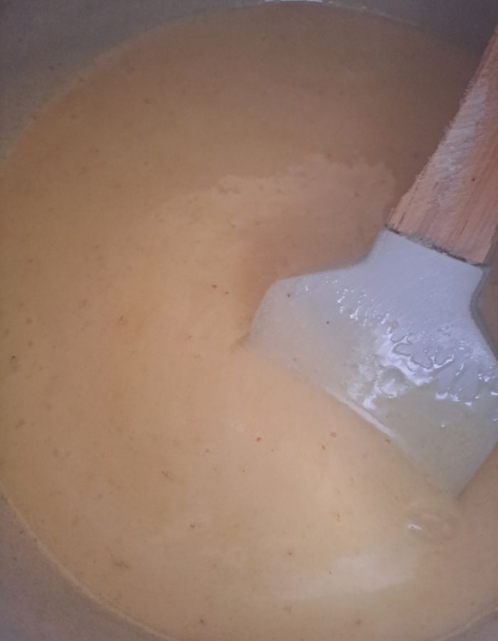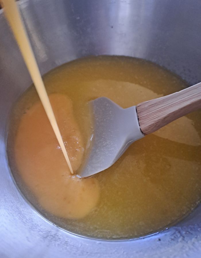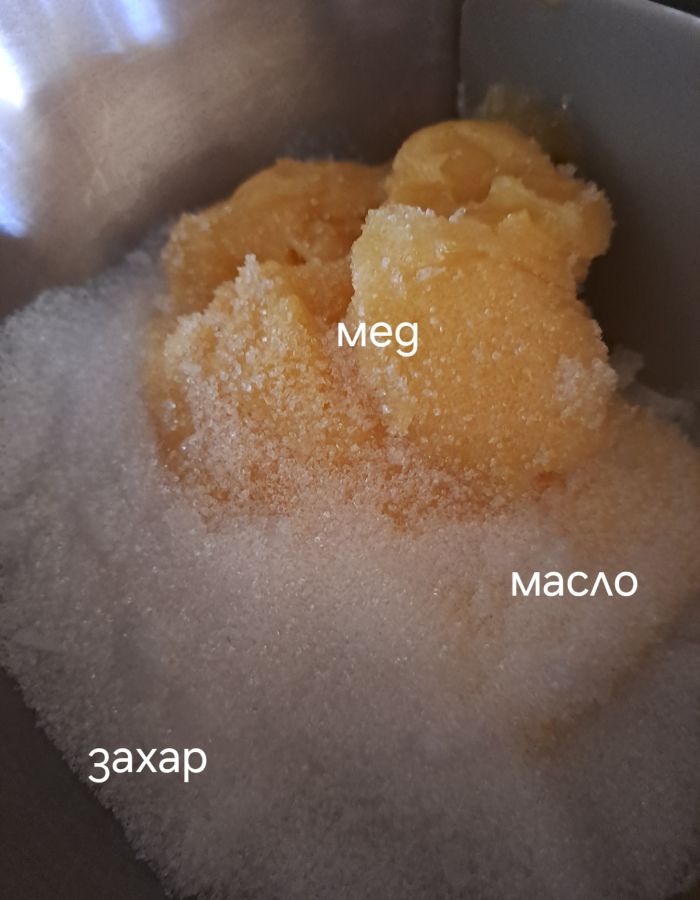 Разтопете захарта, меда и маслото на водна баня, след което разбийте с бъркалка или вилица яйцата. Отстранете от котлона медената смес и добавете яйцата на струйка като бъркате непрекъснато. Когато сместа е добре разбита, върнете съда на котлона за няколко минути или докато забележите, че леко се сгъстява. Свалете от огъня и добавете содата за хляб. Разбъркайте добре и оставете сместа да се охлади.