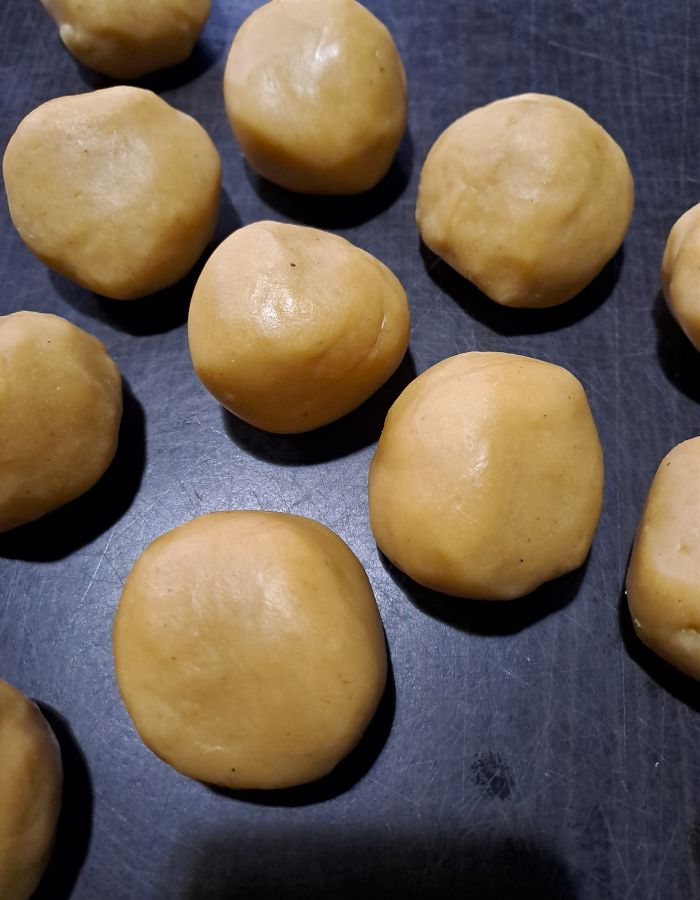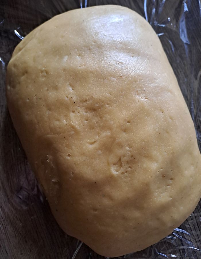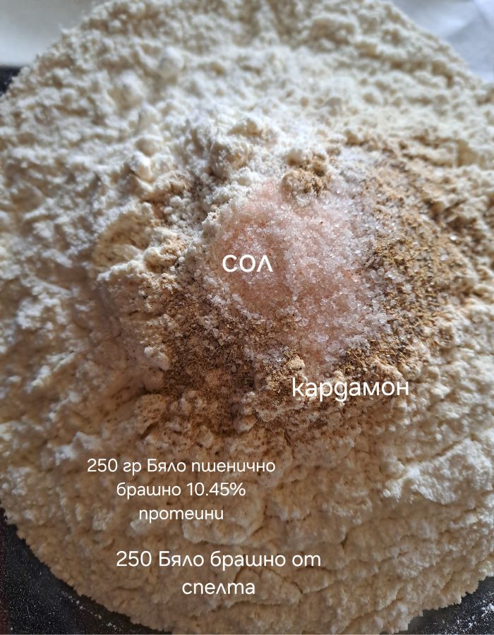 В отделна купа смесете двата вида брашно, солта и кардамона. Добавете сухите съставки към мокрите и размесете добре, докато получите меко и лепкаво тесто (не добавяйте повече брашно). Увийте тестото във фолио и го оставете в хладилника за поне 3-4 часа.