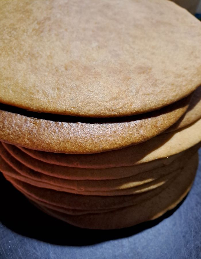 Включете фурната на 180°C (без вентилатор). Разделете тестото на късове с тегло от 90-100 грама. Всяко парче разточете до около 21-22 см и изрежете кръг с избрания диаметър (нашият е 19 см). Разточете още един и ги изпечете заедно, върху покрита с хартия за печене тава за 8-10 минути или докато порозовея. Продължавайте по същия начин с останалите блатове.