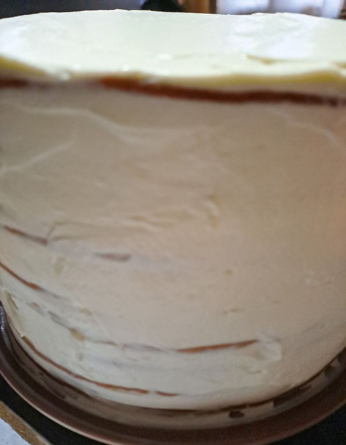 Преминете към оформянето на тортата – сложете един блат, следван от тънък слой крем, повторете процеса и завършете с крем отгоре. Оставете около 200 грама крем за измазване на тортата и един блат, които да натрошите на трохи и да украсите тортата. Когато сте готови, приберете тортата в хладилника поне за една нощ.