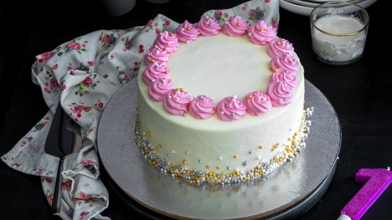 Изсипете розовия крем в пош и декорирайте тортата. Отгоре поръсете със захарната декорация. Приберете в хладилник поне за няколко часа.