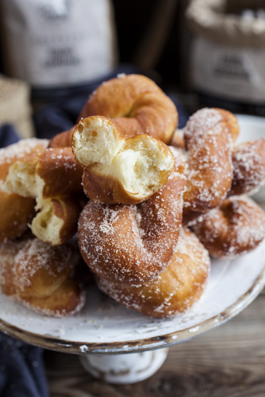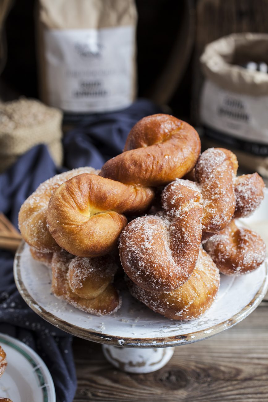 Активирайте маята в леко затопленото прясно мляко и 1 с.л. от захарта. Когато шупне, добавете останалите съставки и омесете много добре тестото. Покрийте купата и оставете да удвои размера си. Когато тестото втаса го разделете на 20 къса, оформете топки и ги покрийте за 15 мин. След почивката, от всяка топка оформете фитил с дължина около 40 см, с едната ръка придържайте единия край на фитила, а с другата го плъзнете нагоре по плота, за да го усучете, вдигнете фитила и отпуснете (вижте видеото), за да се навие и прещипете двата края.