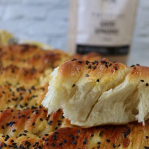 Когато удвои обема си, намажете с жълтък и поръсете със сусам.