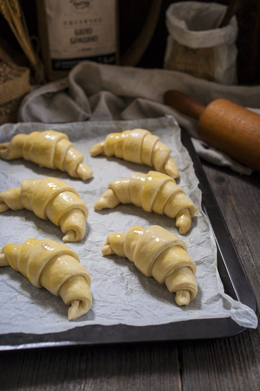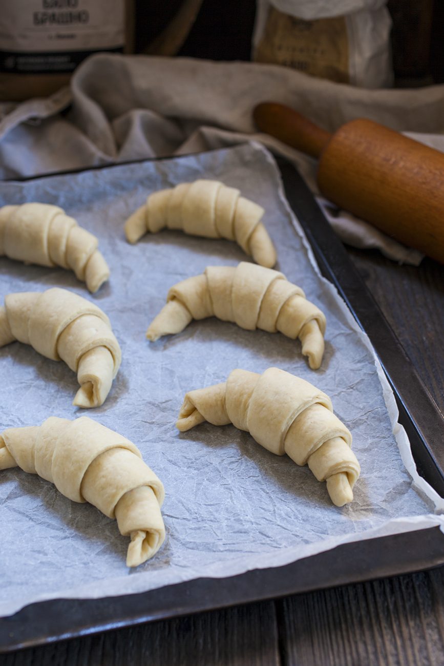 Сложете готовите кроасани върху хартия за печене в тава, покрийте плътно с фолио за съхранение и оставете да втасат за 2-3 ч.
