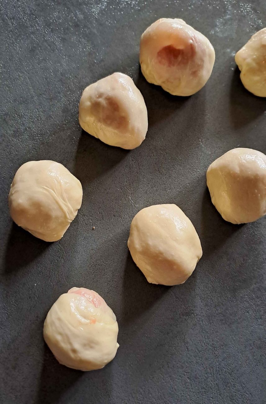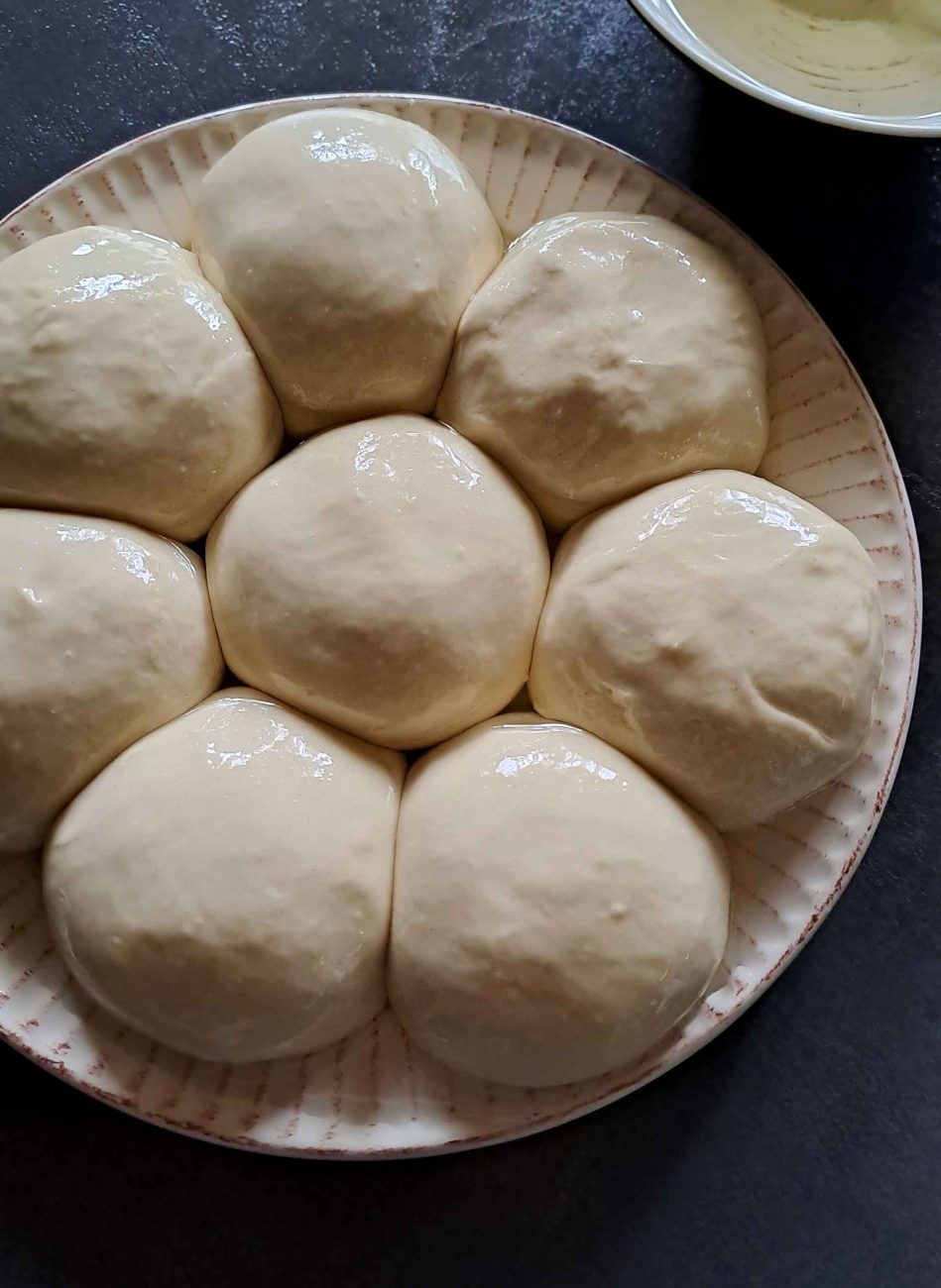 Измесете хубаво тестото, разделете на 6 равни топки, намазнете ги добре с олио, подредете ги в тавичка, залейте ги с останалото олио и ги оставете да починат 30-40 мин покрити.