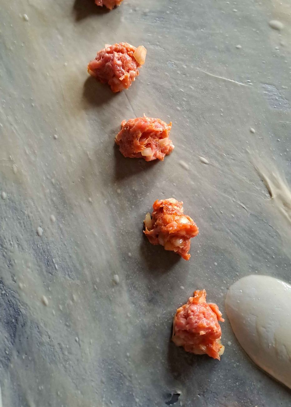 Докато тестото почива, смесете нарязания на ситно лук, каймата и подправките и омесете с ръка добре, за да се разпределят равномерно съставките.