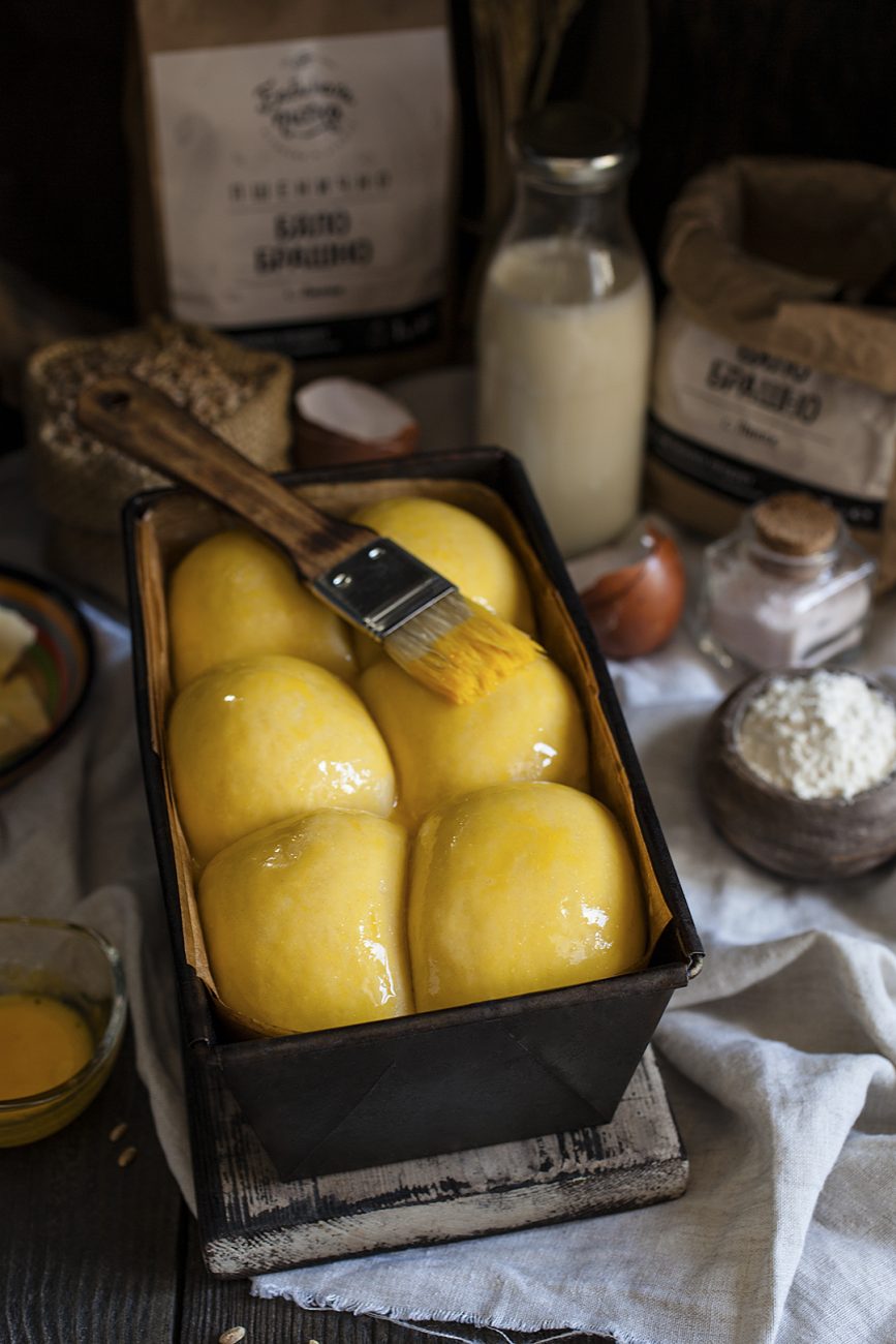 “В рецептата не е използвана никаква захар, както е в оригинал (подобен е на нашия козунак). Трябваха ми няколко опита, за да наместя продуктите в точното съотношение, което да доведе да този пухкав обогатен хляб. Ето и необходимите продукти за форма 20 см”: