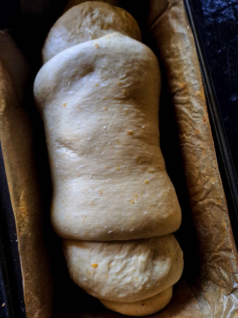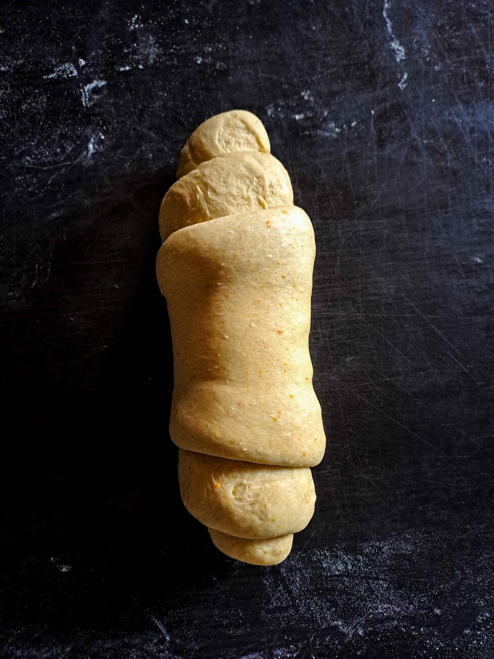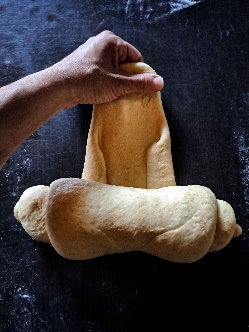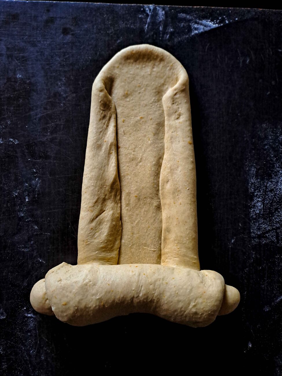 Изсипете втасалото тесто върху набрашнен плот и го разделете на 2 къса, всеки къс оформете на топка и ги покрийте с памучна кърпа за 10-15 мин. След почивката разточете всяка топка във формата, показана на снимката – в горния край с ширината на вашата форма за печене, в долния край по-тясно.