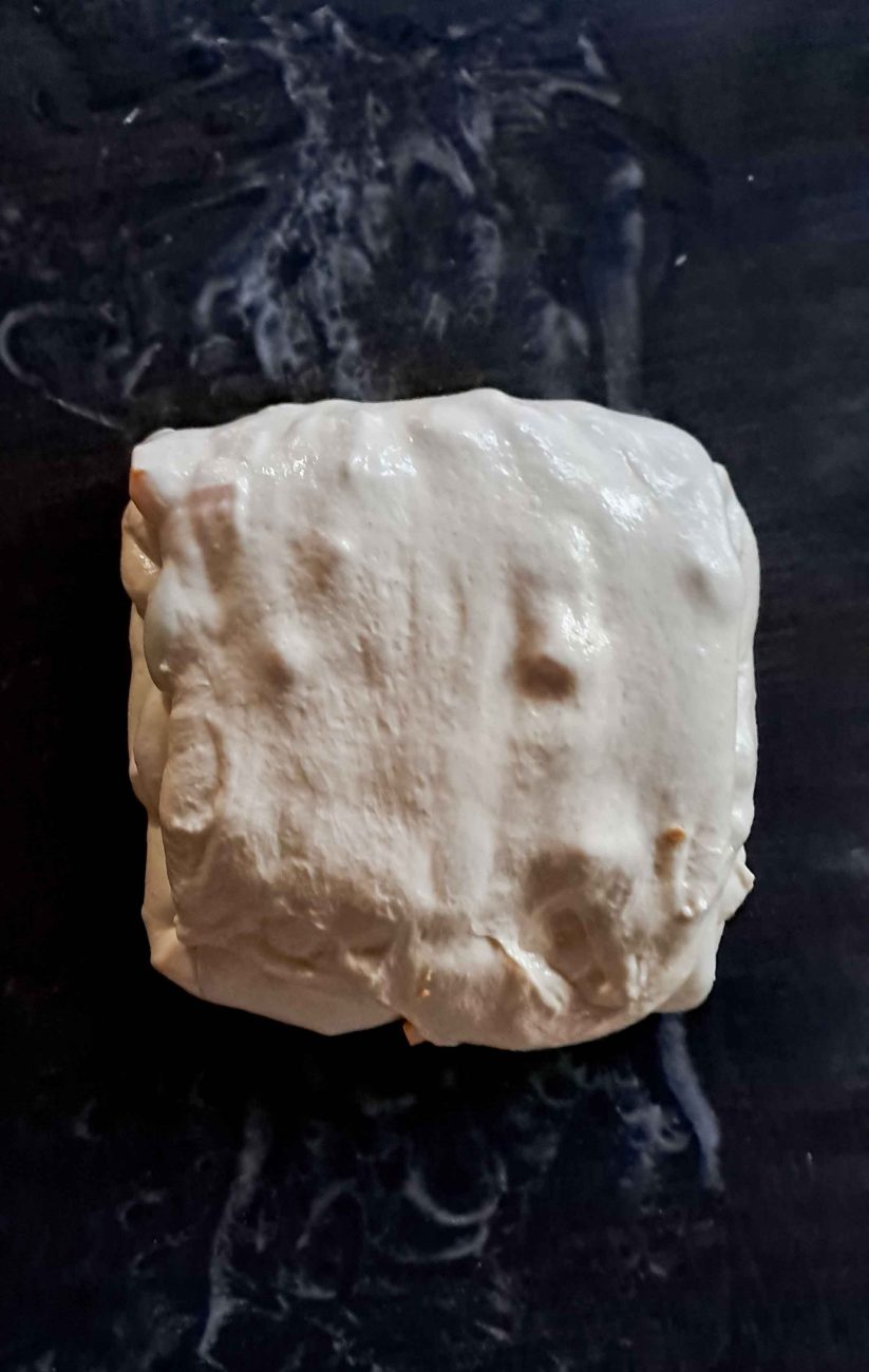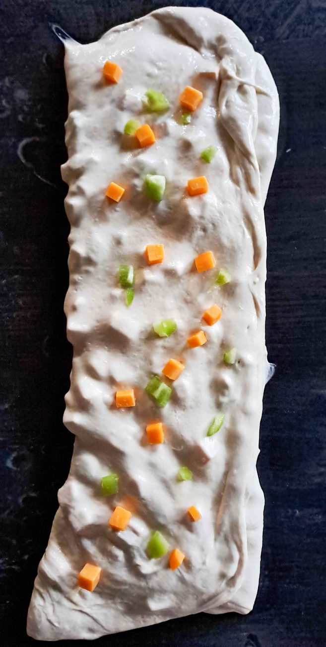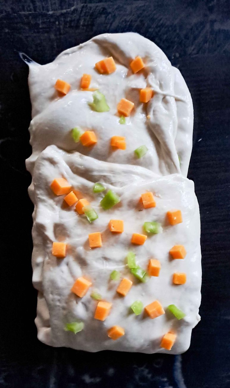 или просто с длан разнесете малко количество вода, изсипете тестото и го разтеглете като кора за баница, поръсете сирене и чушки. Сгънете горната част към средата, поръсете сгънатата част със сирене и чушки, след това долната, отново поръсете със сирене и чушки, след това сгънете към центъра и другите страници. Това е т.нар. ламиниране.