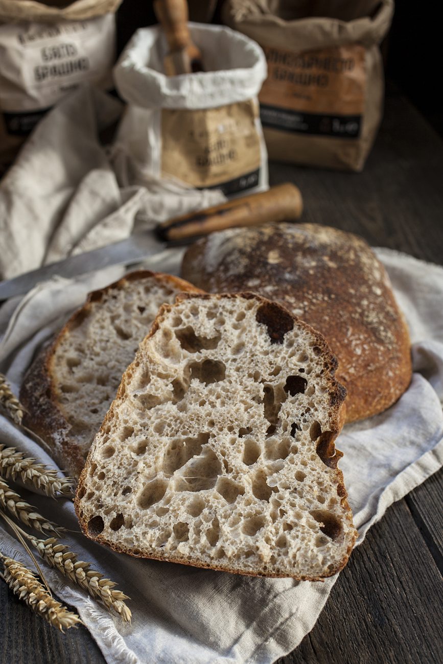 Използвах три вида брашно, за да съчетая вкусове и качества. Високият процент протеин в бялото брашно Бутик, придаде на печивото сила и еластичност, а по-ниското съдържание на глутен в Бялото брашно с 10,45% протеин, придаде ефирността и въздушния ефект на чабатата. За аромат и разкош използвах пълнозърнесто брашно.