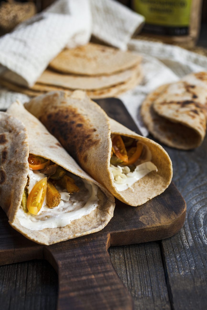 Когато втаса, изсипете върху набрашнена повърхност и разделете на 9 къса по 90 гр, оформете топка и оставете да починат 15 мин. През това време загрейте чугунен тиган или такъв с незалепващо покритие на силен огън. Разточете всяка топка в кръг с диаметър 20 см и изпечете по около 1 мин до кафеникави петънца от всяка страна. Не препичайте, за да не ги изсушите. С тях може да направите домашни дюнери, всякакъв вид сандвичи или просто да ги хапнете с ястие приготвено за обяд или вечеря.