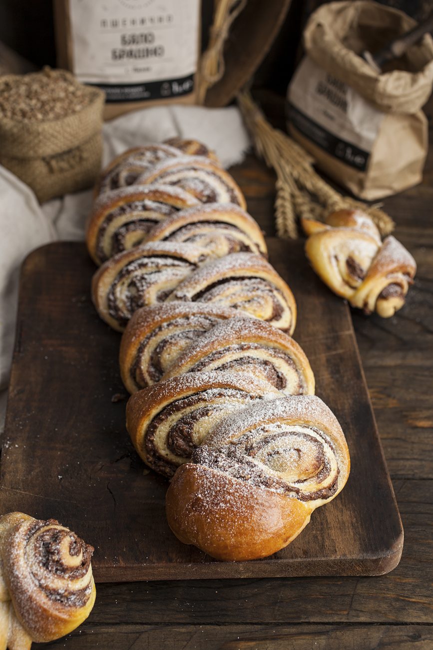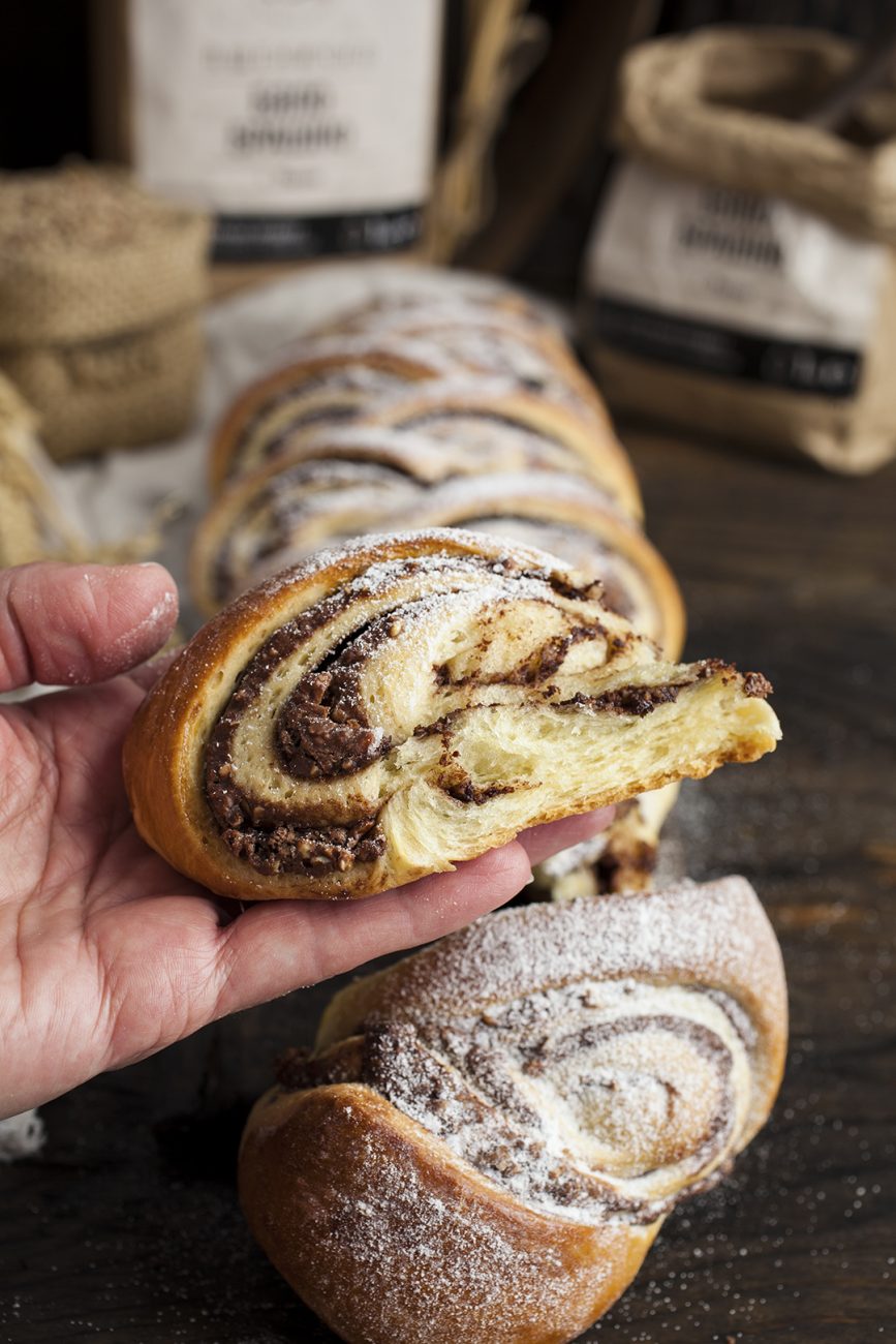 В купата на миксера изсипете всички съставки без маслото и измесете хубаво. Добавете на няколко пъти маслото до пълното му усвояване и отделяне от стените на купата. Прехвърлете тестото в предварително намаслена купа, покрийте я и оставете да втаса до удвояване на обема. Когато тестото втаса, изсипете го върху набрашнена повърхност и разточете на правоъгълник до дебелина 3-4 мм. Намажете с течния шоколад и навийте възможно най-стегнато на руло. Прехвърлете го в тава върху хартия за печене.