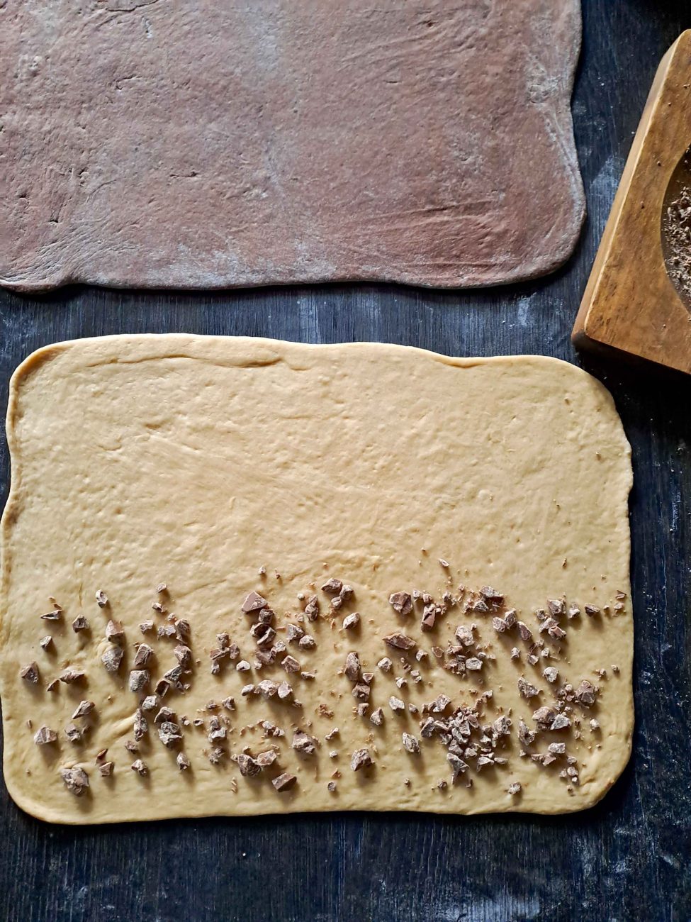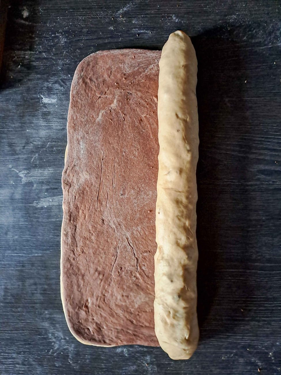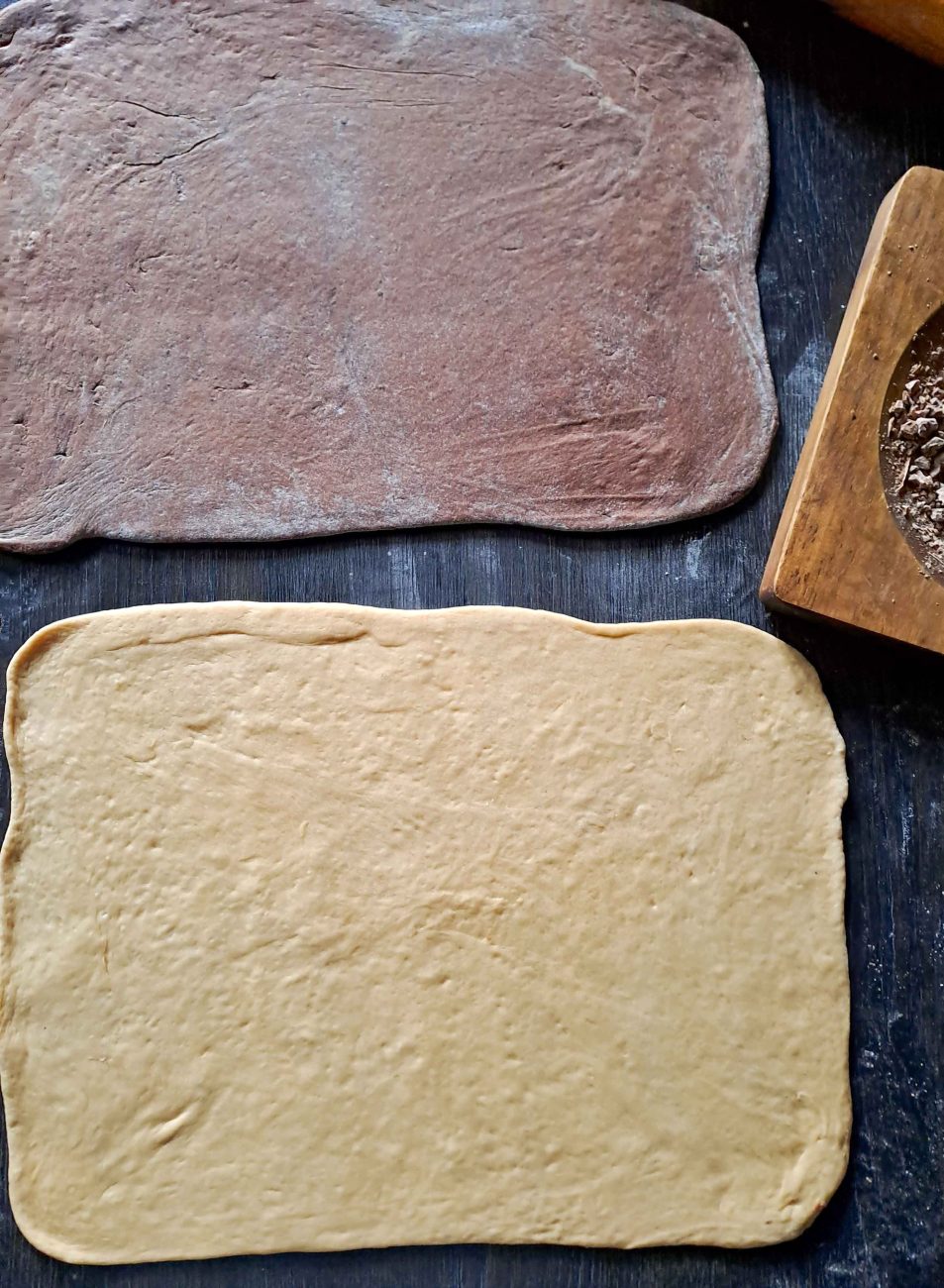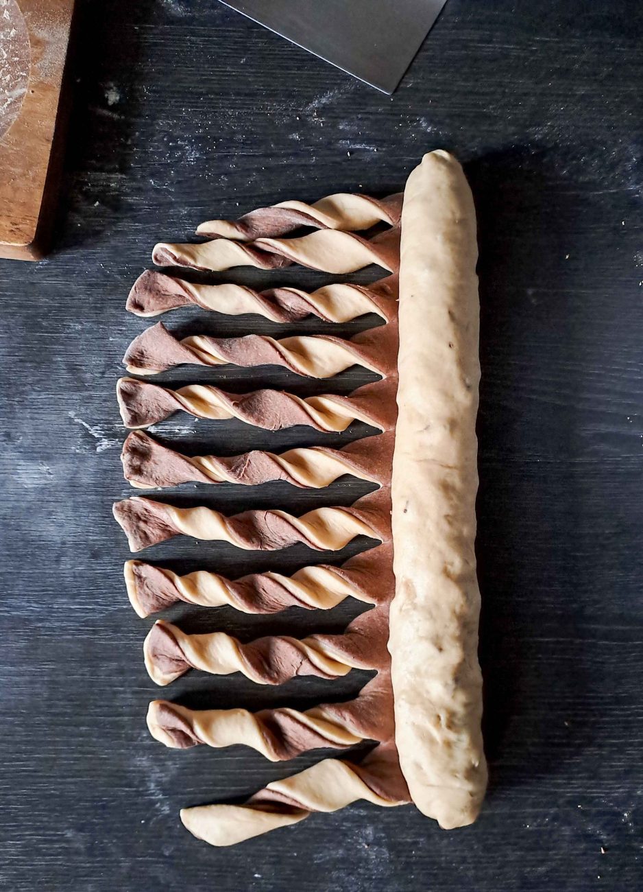 Изсипете бялото тесто върху леко набрашнен плот и разточете на голям правоъгълник, отделно разточете и другото тесто. Върху половината бяло наръсете половината от шоколада и сложете върху него какаовото, върху същата половина поръсете равномерно с останалия шоколад и навийте на руло като оставите 12-13 см от края (вижте снимки от оформянето), останалата част нарежете на 1,5-2 см ивици и усучете всяка една от тях.