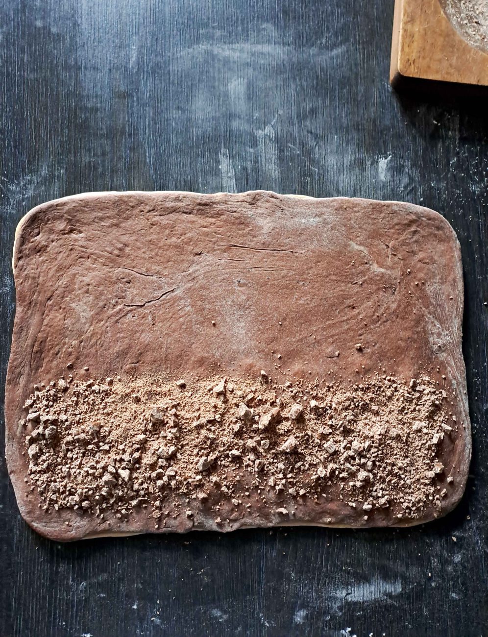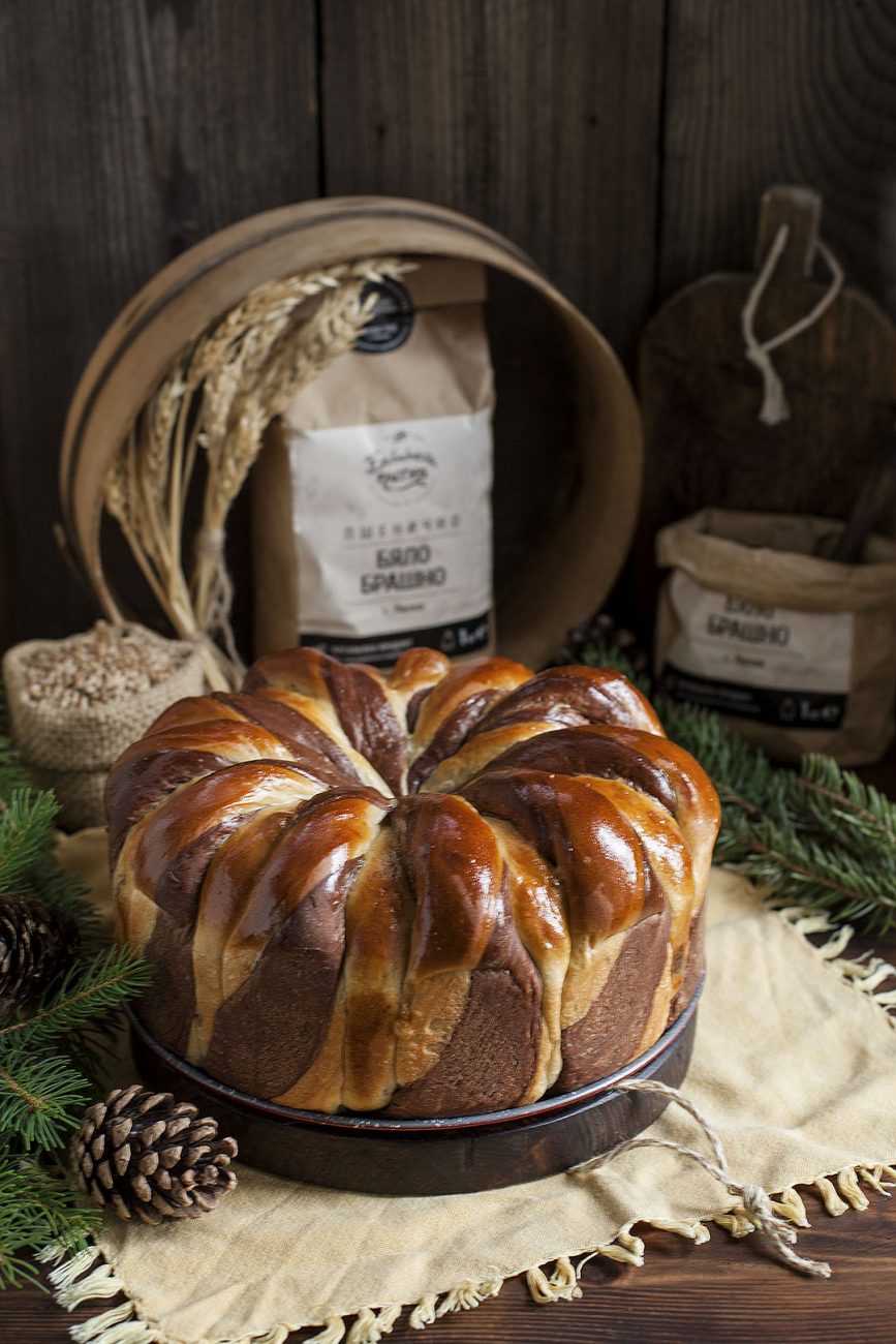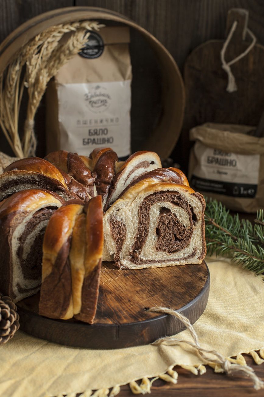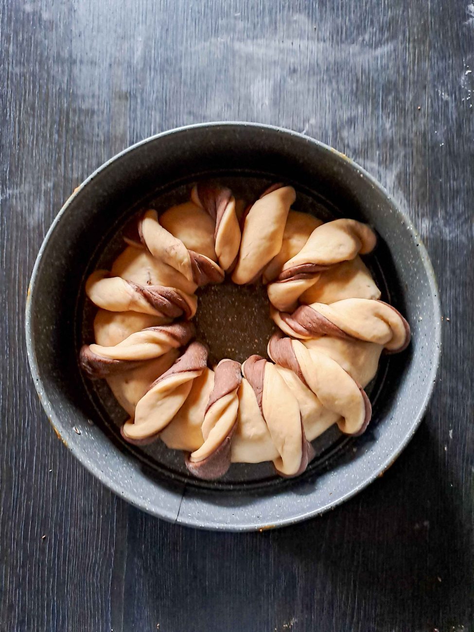 Изсипете бялото тесто върху леко набрашнен плот и разточете на голям правоъгълник, отделно разточете и другото тесто. Върху половината бяло наръсете половината от шоколада и сложете върху него какаовото, върху същата половина поръсете равномерно с останалия шоколад и навийте на руло като оставите 12-13 см от края (вижте снимки от оформянето), останалата част нарежете на 1,5-2 см ивици и усучете всяка една от тях.